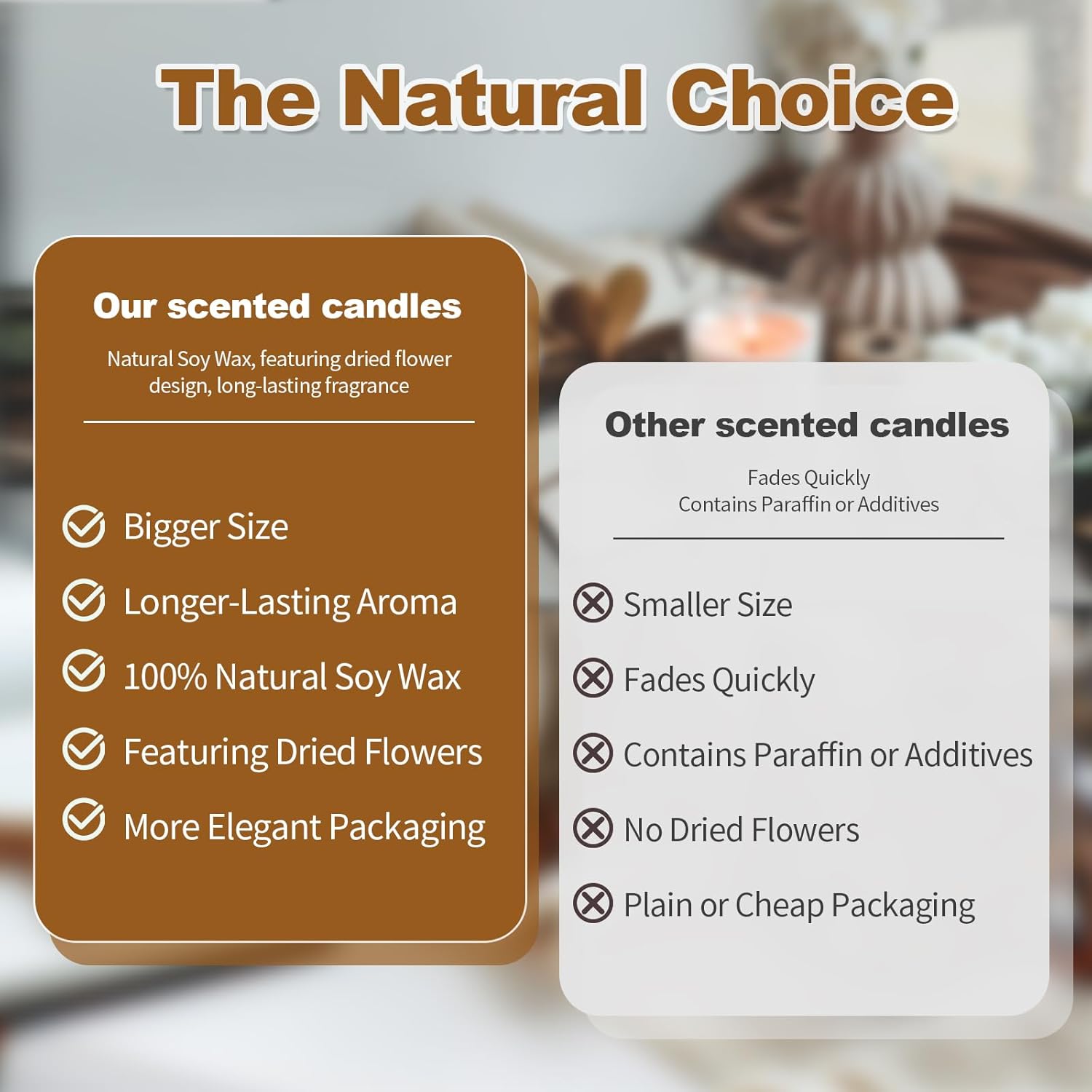 100% Pure Soy Wax & Cotton Wick: These candles are created from eco-friendly pure soy wax and have cotton wicks. Get pleasure from a clear, long-lasting burn with a soothing perfume, free from dangerous chemical substances.