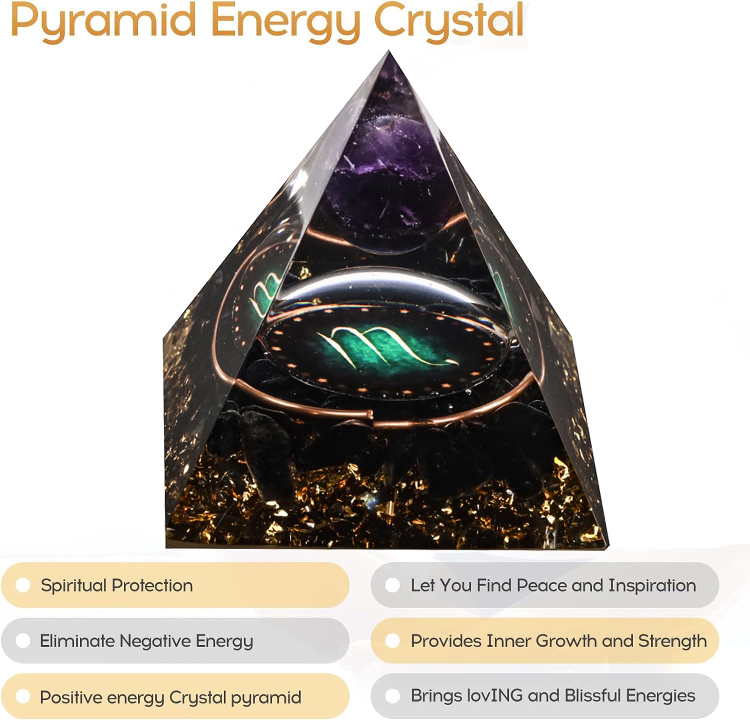 🌱【Therapeutic Crystal Pyramid】: Orgone Pyramid is product of pure Amethyst crystal sphere,Obsidian,gold foil,natural resin.