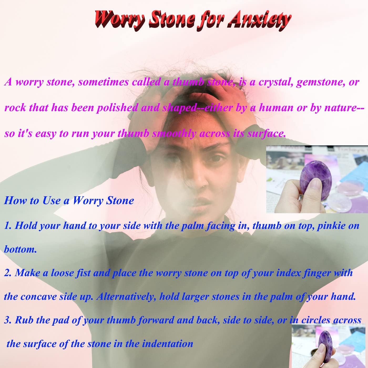 【Use Directions】:Merely maintain the stone’s indentation towards your thumb, place your fingers of the identical hand excessive of the stone, and rub the stone between your thumb and fingers.