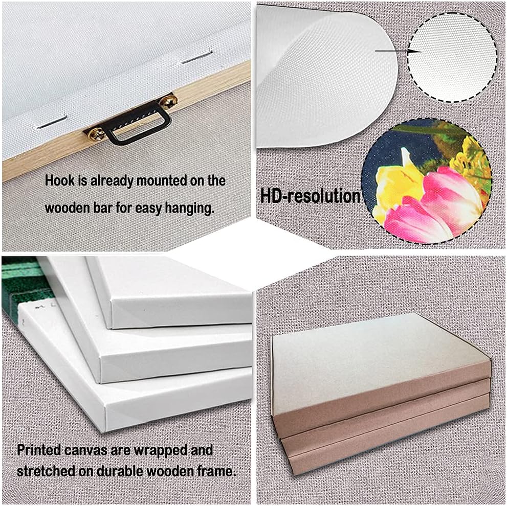 Prime quality printed canvas stretched on stable wood frames, gallery wrapped.Hook is already mounted on frames, Simple to hold.