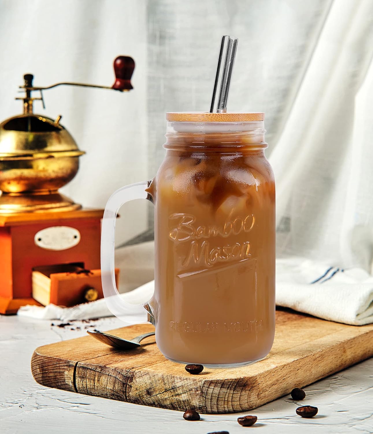 LARGE CAPACITY GLASS CUPS WITH LIDS AND STRAWS: Massive capability of 24oz/710 ml. You may get pleasure from your drinks with out worrying about spilling it, due to the bamboo lids with silicone ring. It additionally has metallic straw which helps you to drink from the jars with out opening the lids.