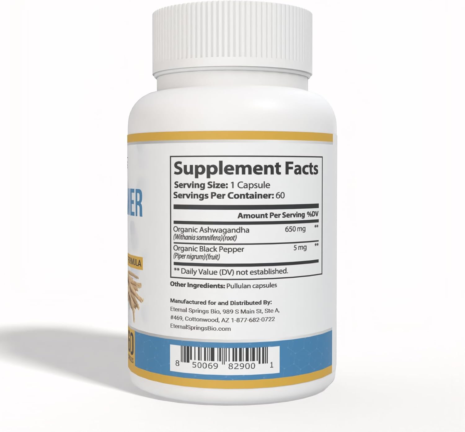 Components: Natural Ashwagandha and Black Pepper for stress reduction and vitality