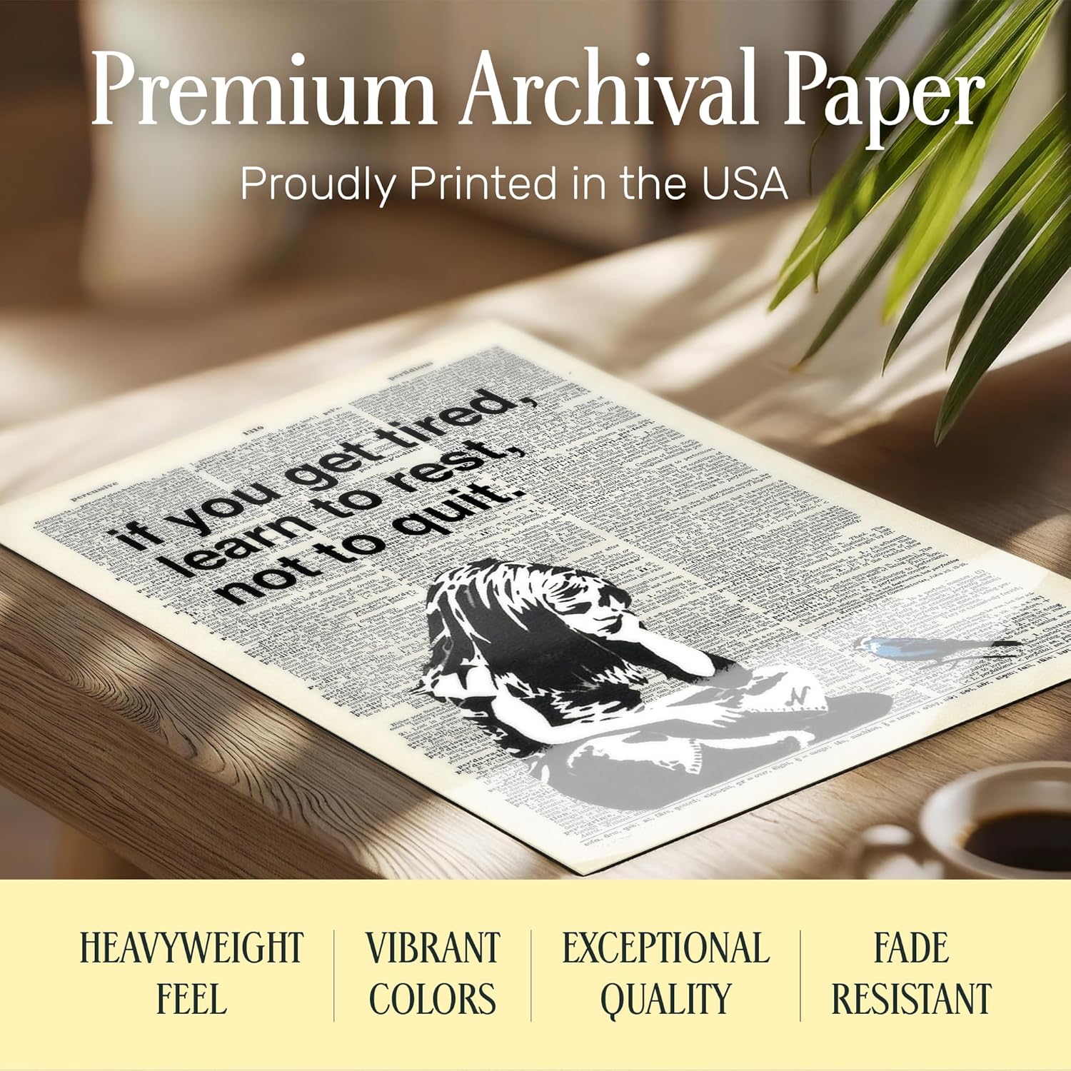 Remodel your area with this putting Banksy-inspired motivational artwork print that includes the highly effective reminder “Should you get drained, be taught to relaxation, To not stop.” This modern wall artwork combines fashionable avenue artwork model with classic dictionary web page aesthetics, creating a singular dialog piece that evokes perseverance. Printed on premium Fuji Crystal Archive Paper, this high-quality 11×14 artwork print delivers distinctive element and memorable sturdiness. The heavyweight, fade-resistant paper ensures your inspirational art work stays lovely for years to return, proof against mud and fading over time. Good for dwelling places of work, residing rooms, bedrooms, or as a considerate reward for pals going through challenges, this dictionary web page artwork print serves as a day by day reminder to persevere via tough occasions. The minimalist black and white design with a refined blue accent enhances any decor model from fashionable to rustic. This print comes unframed, permitting you to pick out the right body that matches your private model and present decor. Proudly made within the USA, our prints preserve the best requirements of expertise and high quality.