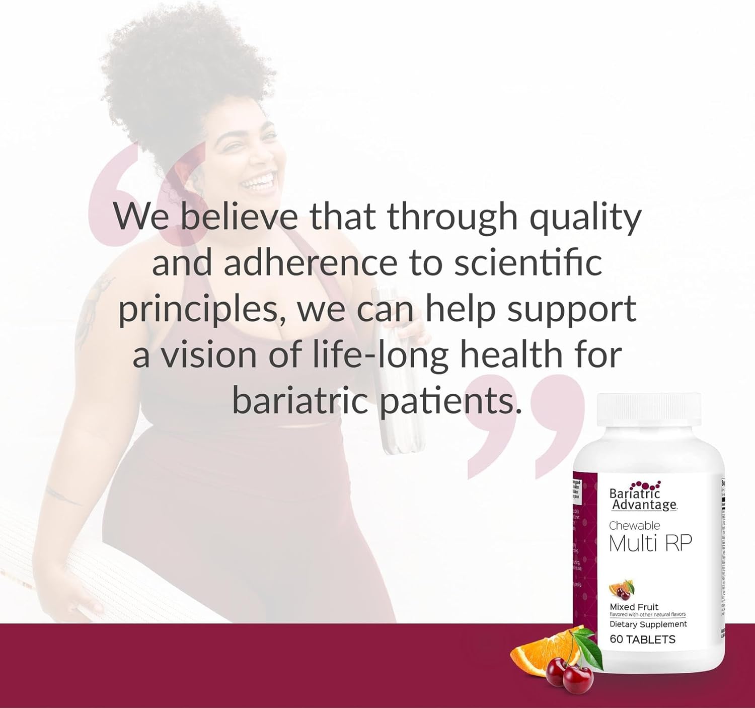 Bariatric Benefit RP Multivitamin is a specifically crafted dietary complement, designed to help the distinctive nutrient wants of people that have undergone restrictive procedures like a gastric band or balloon.* As a complete mix of bariatric nutritional vitamins, it gives at the very least 100% Each day Worth of 18 important nutritional vitamins and minerals.* This contains not solely the B-complex nutritional vitamins like B1 and B12 but in addition fat-soluble nutritional vitamins like vitamin A and vitamin E.This bariatric multivitamin chewable format provides a handy and palatable possibility for individuals, negating the necessity to swallow cumbersome tablets.* It is infused with a pleasant taste, making the each day nutrient consumption a pleasing expertise. Notably, it contains essential minerals like zinc, copper, iron, and magnesium, that are essential for the physique’s total functioning and well-being.*Furthermore, this multivitamin complement is gluten free, making it an acceptable alternative for these with dietary restrictions. It additionally comprises different very important vitamins reminiscent of inositol, pantothenic acid, thiamin, and biotin, making certain a wholistic dietary method. As with every dietary complement, it is beneficial to seek the advice of with a healthcare practitioner for customized recommendation.Take 2 tablets as soon as each day or as directed by your healthcare practitioner. Chew or crush tablets utterly earlier than swallowing. Don’t swallow tablets complete.Bariatric Benefit dietary dietary supplements and merchandise are scientifically formulated to satisfy the specialised specialised dietary suggestions for individuals who have undergone bariatric proceduress or are following a specificaly designed and supervised program. We imagine that by way of high quality and adherence to scientific rules, we may help help a imaginative and prescient of life-long healh previous bariatric procedures.
