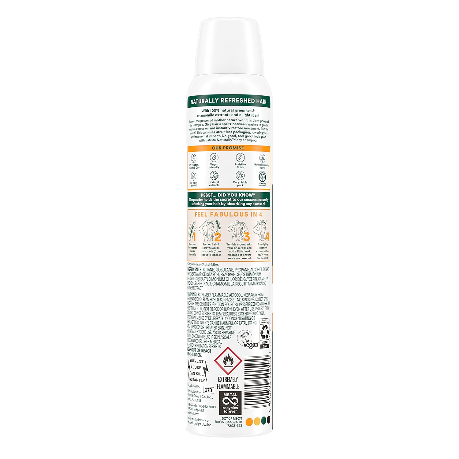 Harness the ability of mom nature with this plant-powered dry shampoo. Give hair a spritz between washes to softly take away extra oil and immediately restore motion. And the bonus? This will makes use of 40%* much less packaging, decreasing your environmental affect. Do good, really feel good, look good with Batiste Naturally.