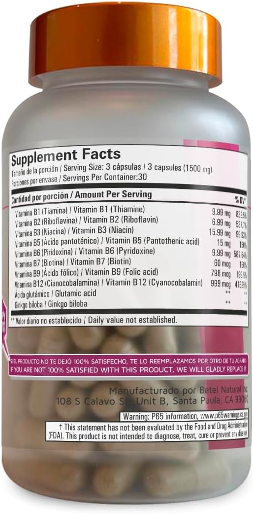 El Complejo B Reforzado de Betel Pure está diseñado para brindarle a tu cuerpo el espectro completo de vitaminas B esenciales, junto con los beneficios adicionales del ácido glutámico y el ginkgo biloba. Esta combinación poderosa apoya la producción de energía, ayuda a mantener un sistema nerv saludable y favorece la claridad. Cada porción de 3 cápsulas ofrece 1500 mg de ingredientes naturales y de alta calidad, fabricados en una instalación registrada por la FDA para tu confianza y seguridad. Ultimate para quienes buscan aumentar su energía diaria, apoyar la función cerebral y mantener el bienestar normal. Betel Pure’s Bolstered B-Advanced is designed to provide your physique the whole spectrum of important B nutritional vitamins plus the added advantages of glutamic acid and ginkgo biloba. This highly effective mixture helps your vitality manufacturing, helps keep a wholesome ner system, and promotes psychological. Every serving of three capsules offers 1500 mg of pure, high-quality substances manufactured in an FDA-registered facility to your confidence and security. Good for people seeking to increase day by day vitality, assist mind perform, and keep general well-being.