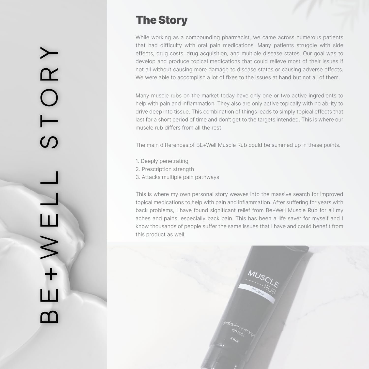 As a compounding pharmacist with private ache struggles, I created BE+Effectively muscle rub—an reasonably priced, all-in-one topical answer. In contrast to typical lotions, it targets a number of ache pathways and deeply penetrates tissue. It’s helped many with muscle ache, arthritis, sprains, and extra. Backed by science and expertise, this rub delivers highly effective aid with out the drawbacks of oral meds.