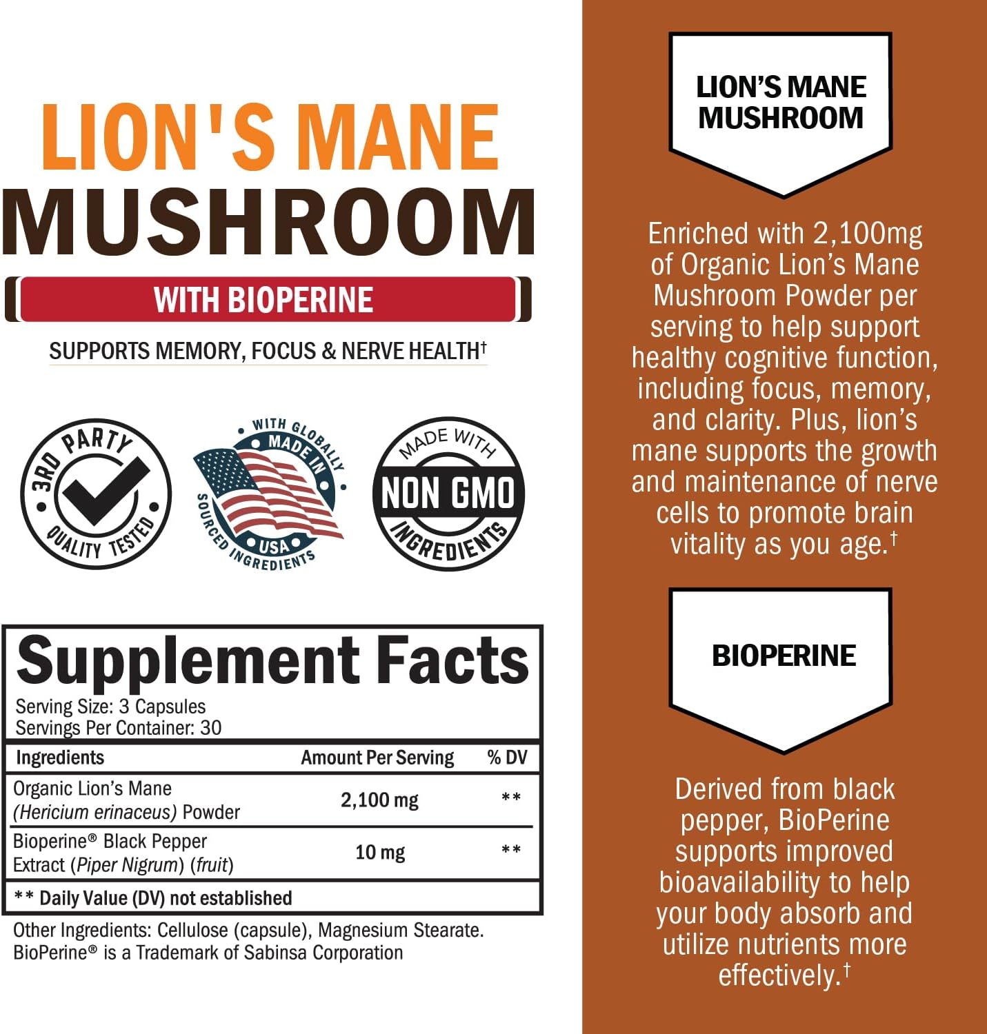 Additional Power Lion’s Mane Mushrooms – BioSchwartz Lions Mane Complement supplies you with 2,100 mg of extremely excessive purity natural lion’s mane mushroom per serving