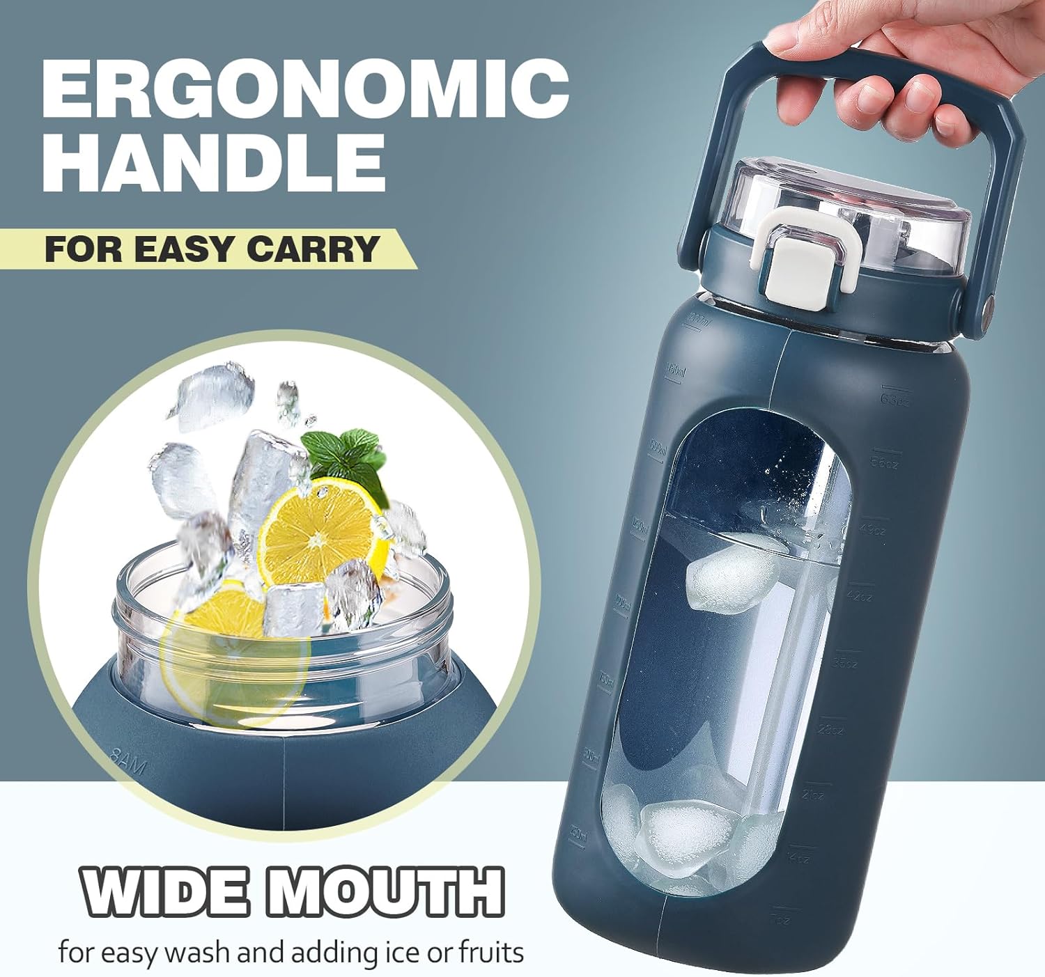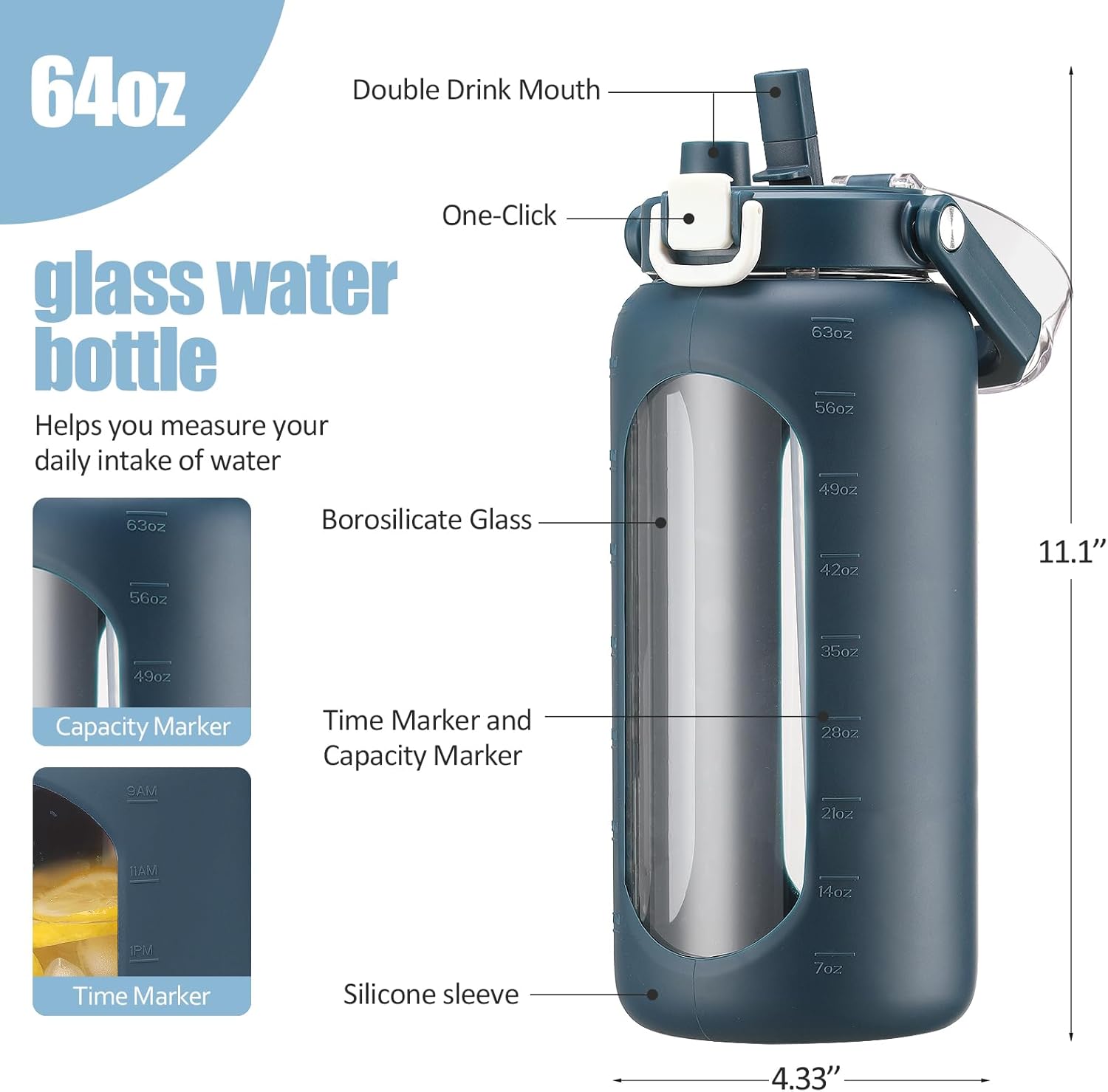 Be the first to review “BLUEGO 64oz Glass Water Bottle with Handle and Straw, Motivational Sports Water Bottle with Time Marker and Silicone Sleeve Leakproof Drinking Bottle for Travel Gym Workout, Dark Blue”