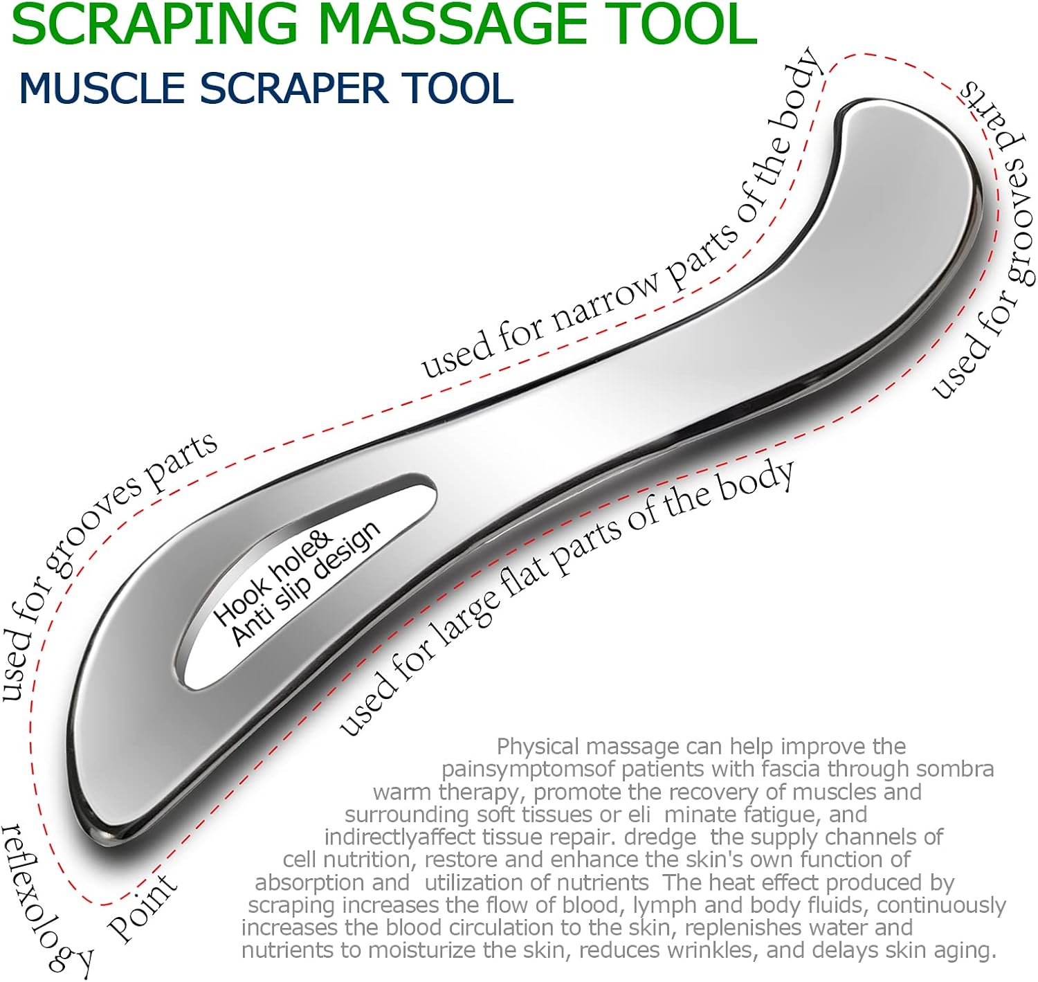 ♕This Stainless Metal Muscle Scraper Device will help relieve muscle ache, Soreness and stress, break delicate tissue adhesion and fascia limitation, Promote blood circulation,Stimulate regional pink blood cell renewal,And improve pores and skin elasticity and tightness by making use of stress on elements, Scraping muscle groups and scraping therapeutic massage