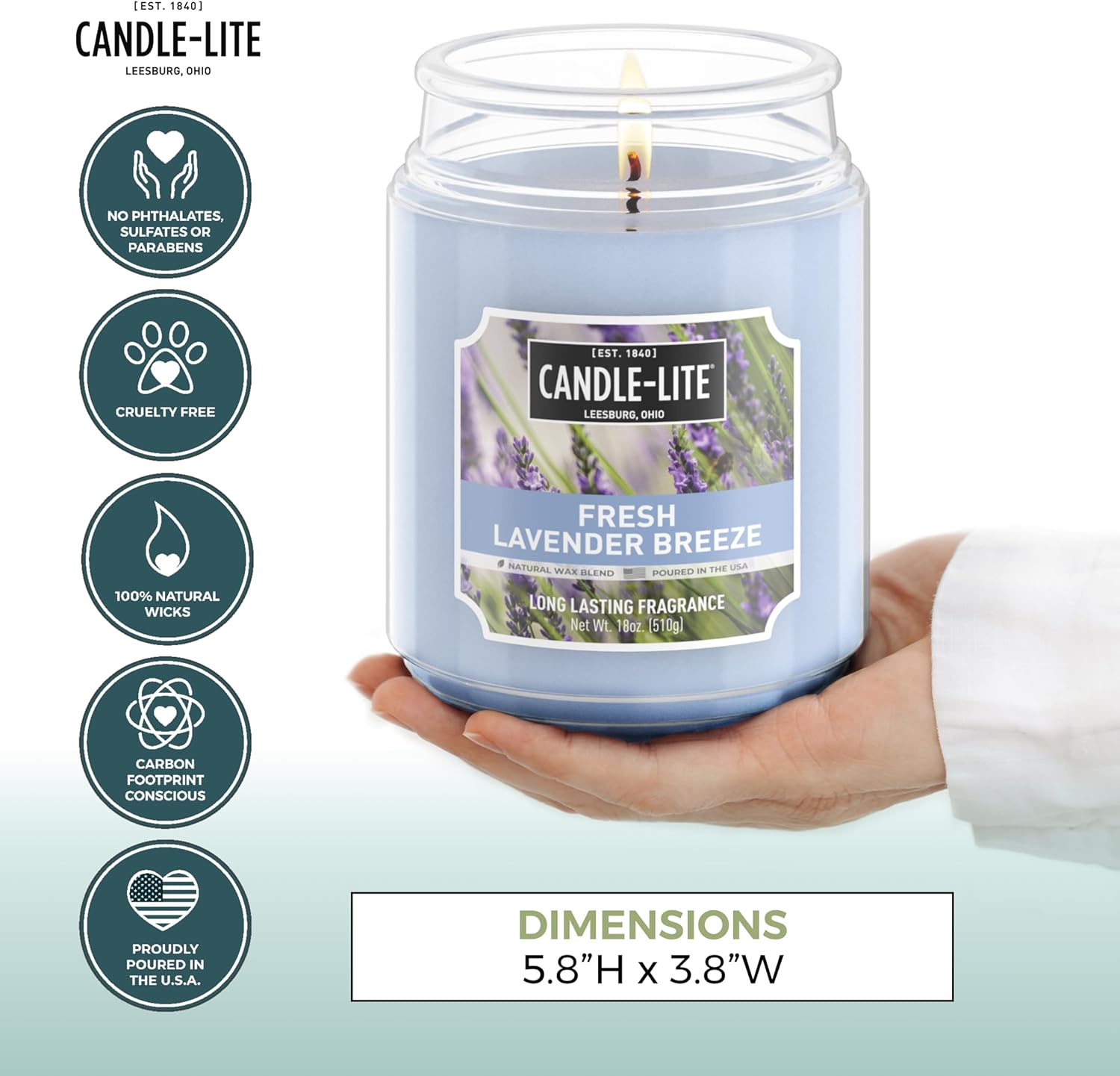 Candle-lite Scented Candles, Fresh Lavender Breeze, 18 oz Jar, Proudly Poured in The USA, Aromatherapy Candle, Single-Wick with 110 Hours of Burn Time, Perfect for Creating a Relaxing Ambiance