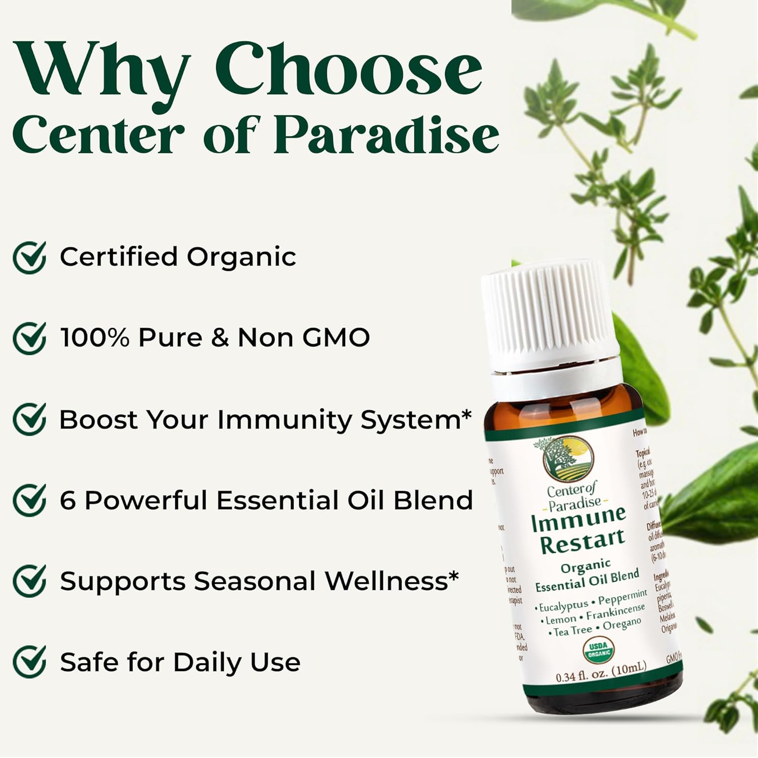 Be the first to review “Center of Paradise Immune Restart Organic Essential Oil Blend for Immune Support* (10 ml) – USDA Certified & Non-GMO Blend of Eucalyptus, Peppermint, Tea Tree, Lemon, Frankincense & Oregano Oils”