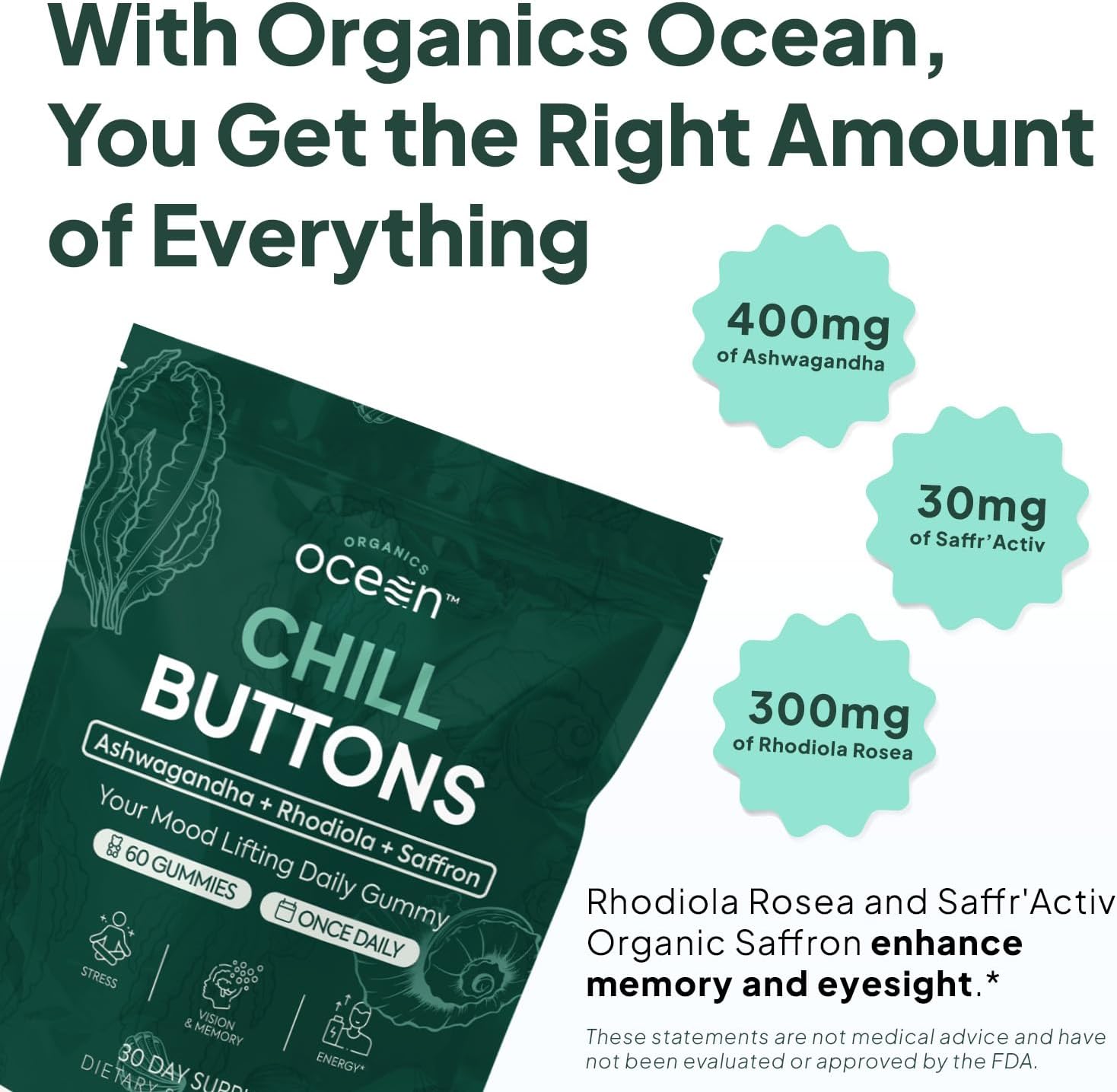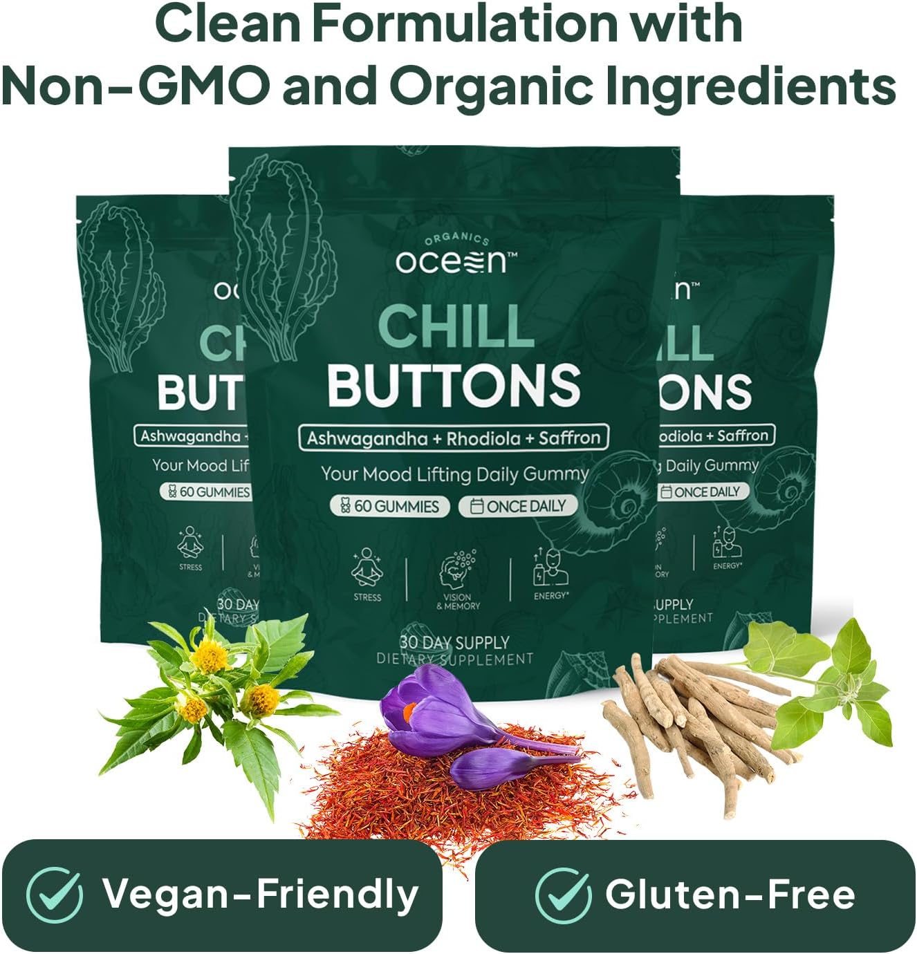Chill Buttons by Organics Ocean has 400mg of Ashwagandha KSM-66, a premium ashwagandha ingredient, that can assist you win the day by selling leisure and serving to the physique handle stress. It enhances your cognition and imaginative and prescient because of 200-300mg of Rhodiola Rosea and 30mg of Saffr’Activ Natural Saffron. This clinically studied dosing is perfect in direction of bettering your cognitive and imaginative and prescient well being! This gummy complement helps brighten your temper and increase your vitality. Due to its adaptogenic properties, Rhodiola Rosea can fight fatigue, sustaining your vitality for the day. And patented saffron extract helps a optimistic temper and higher focus. A science-backed formulation of Ashwagandha KSM-66, Rhodiola Rosea, and Saffr’Activ Saffron harnesses historical botanical knowledge and trendy science. It’s also non-GMO, natural, vegan-friendly, and gluten-free!