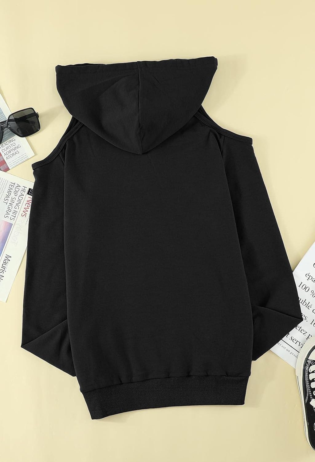 Materials: 65% Cotton+30percentPolyester+5percentElastaneSoft and comfy cloth, light-weight hoodie sweatshirtsLong sleeve, hooded with drawstring, entrance pockets lower out shoulder hoodie
