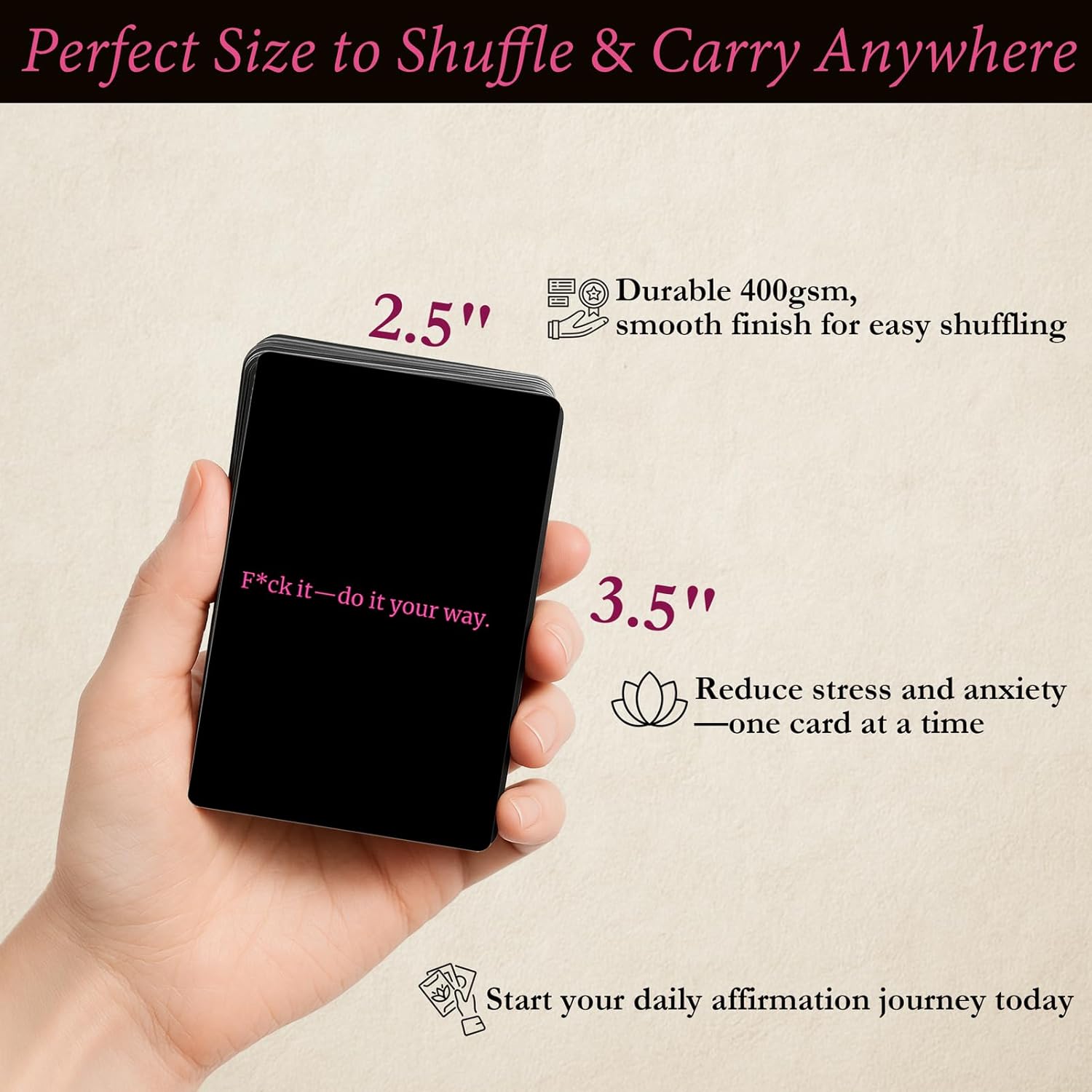 POWER IN YOUR POCKET: Completely sized (2.48×3.68″) on your purse, desk, or journey. Premium, easy-to-handle playing cards for on-the-go inspiration each time it’s essential to channel your interior power.