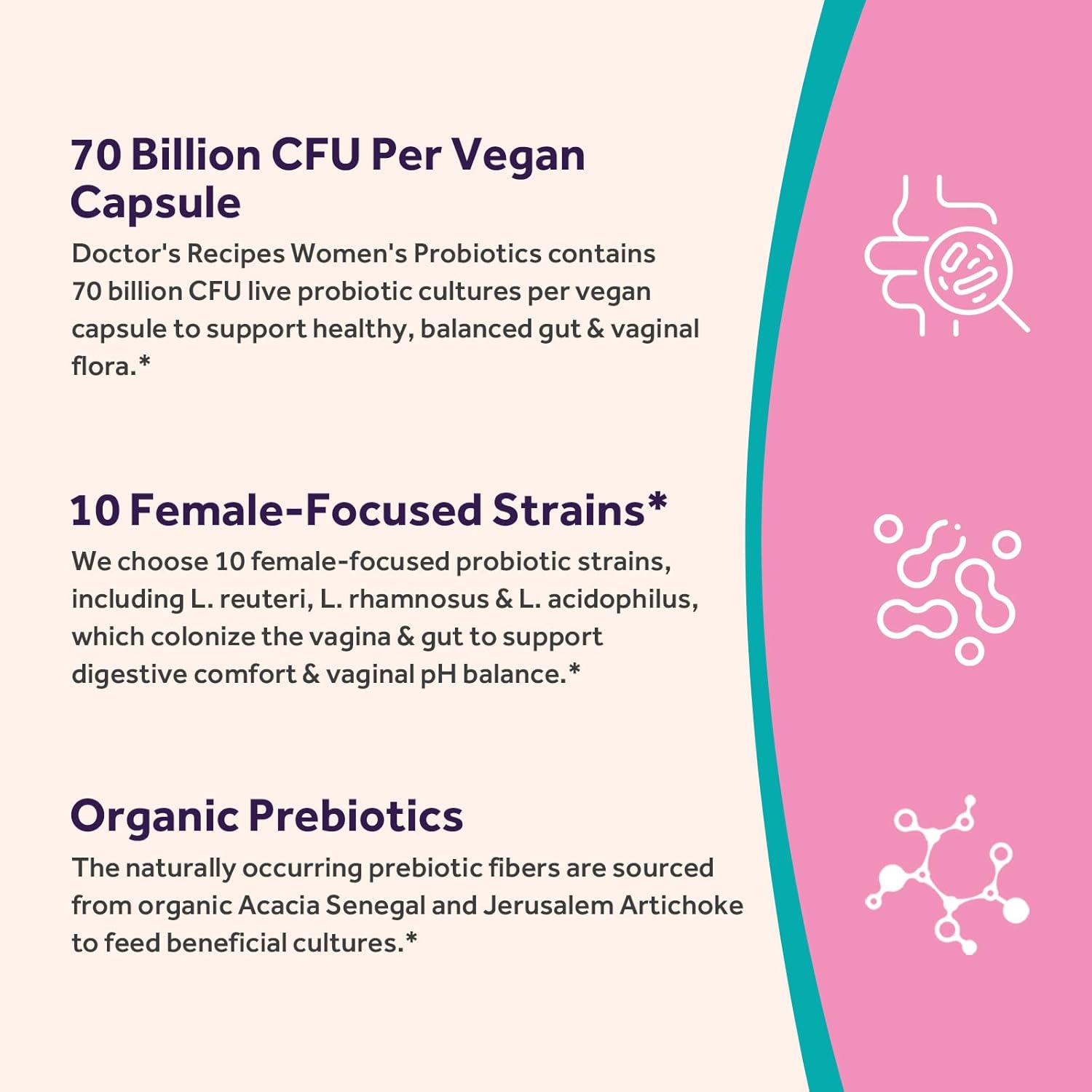 Natural Prebiotics and Probiotics: Physician’s Recipes Girls’s Probiotics incorporates 70 billion CFU, 10 gynecologist-recommended, 10 rigorously chosen probiotic strains (together with L. reuteri & L. acidophilus), colonizing in your intestine and vagina to assist wholesome flora.* This vaginal probiotics additionally incorporates 150 mg of naturally occurring prebiotics from natural Acacia Senegal and natural Jerusalem Artichoke Root, two of one of the best soluble fibers that gasoline useful tradition progress.*