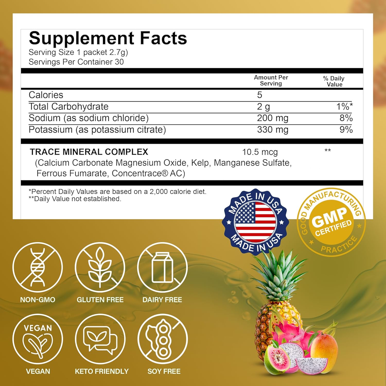 Powdered water-soluble sports activities drink formulation that mixes with liquid for FAST and EASY absorption., Balances and Restores HEALTHY Electrolyte Ranges for Tremendous Hydration. Minerals, together with magnesium, sodium, and potassium. Hint parts of zinc and 72 different hint minerals.