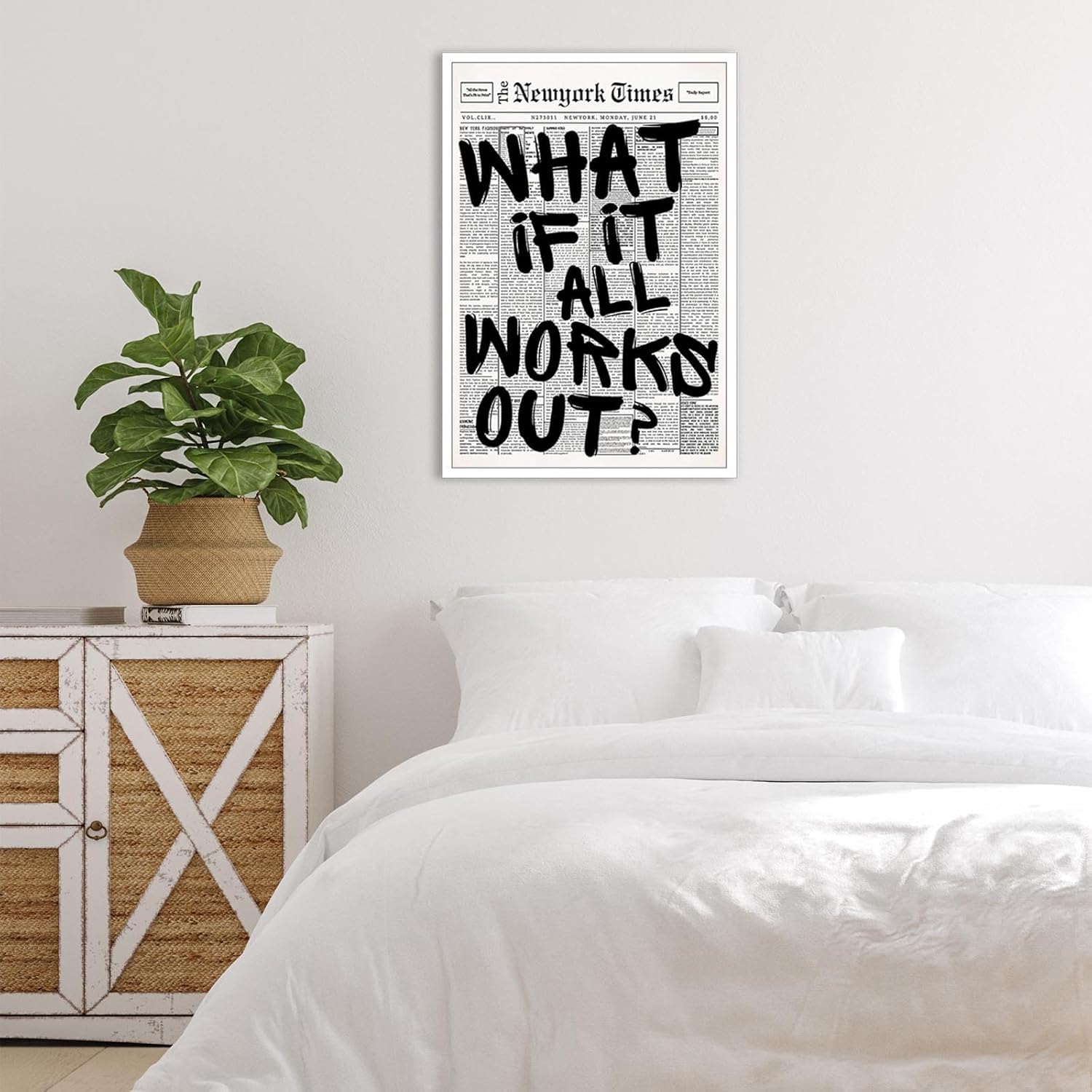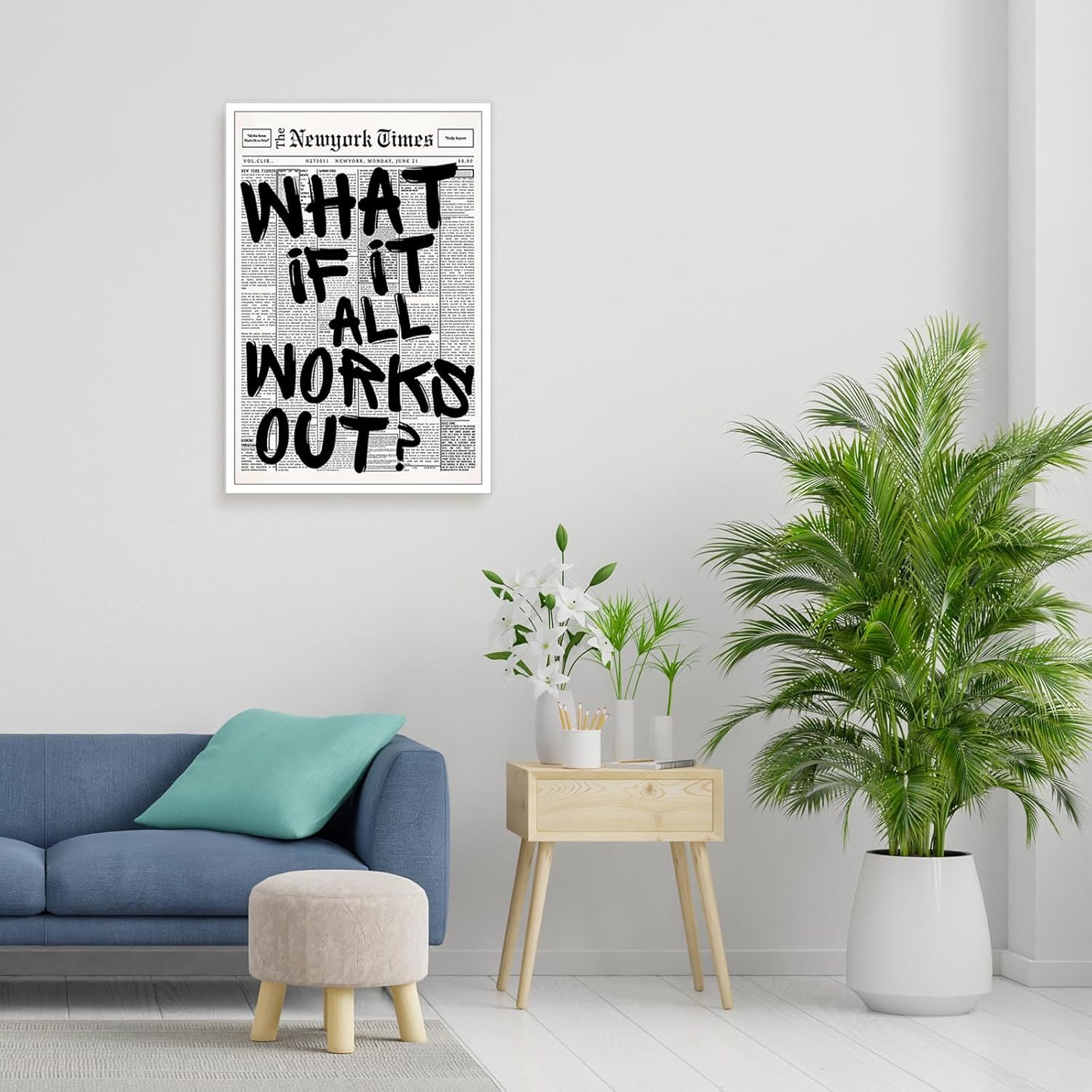 Inspirational Design: That includes the enduring “What If It All Works Out” quote, this retro black and white newspaper canvas wall artwork brings positivity and affirmation to any house with its minimalist aesthetic attraction.