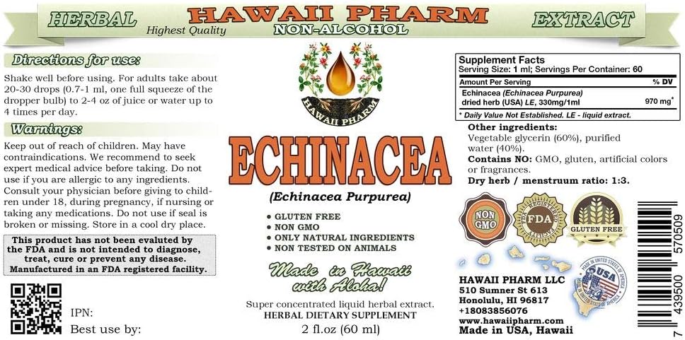 Be the first to review “Echinacea Alcohol-Free Liquid Extract, Organic Echinacea (Echinacea Purpurea) Dried Herb Glycerite Hawaii Pharm Natural Herbal Supplement 2 oz”