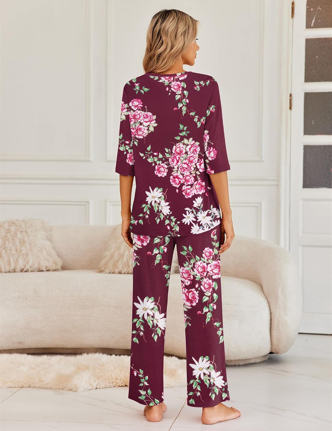 Ekouaer Womens Lounge Sets 2 Piece Pajamas Sets 3/4 Sleeve Tops and Long Pants Soft Pjs Loungewear with Pockets