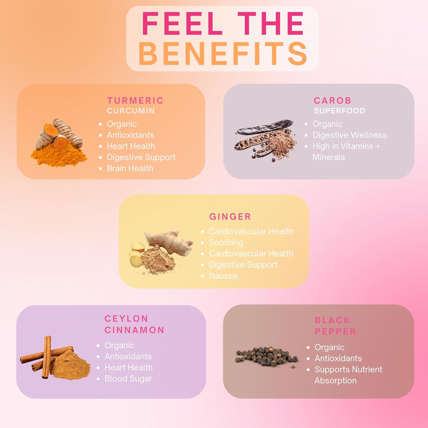 Ginger Golden Milk : Savor our vegan, gluten-free mix harking back to spicy chai. With turmeric, black pepper, ginger, cinnamon, and a touch of pumpkin spice, it is an elixir of scrumptious indulgence.
