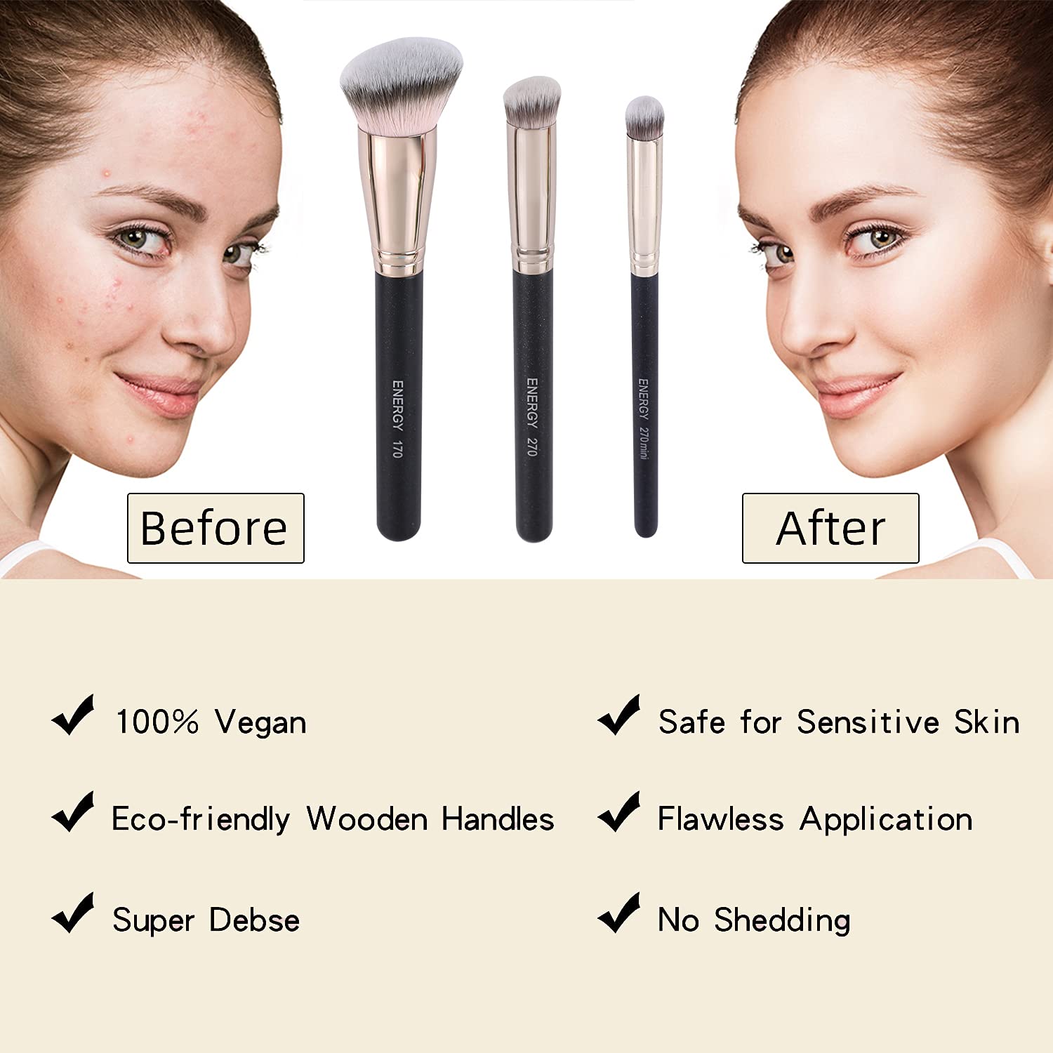ENERGY Makeup Brush Set Professional 3pcs Foundation Concealer Detail Brushes Soft Synthetic Bristles Vegan Face Makeup Brushes for Liquid Cream Powder Flawless Blending Buffing with Travel Case