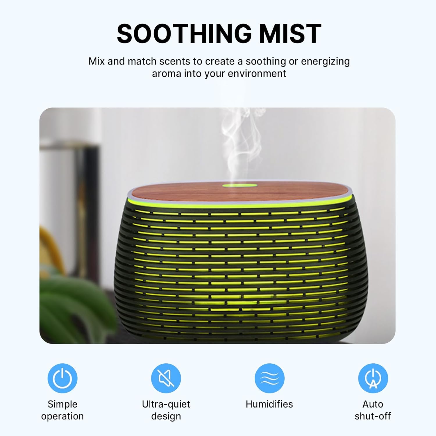 UNIQUE HOLLOW DECORATIVE DESIGN: The important oil diffuser humidifier options elegant cutout artwork and wooden grain floor design, make aromatherapy diffuser appear to be an exquisite and romantic ornament. Diffuser is an ideal decor used at properties, workplace, spa decor or meditation decor.