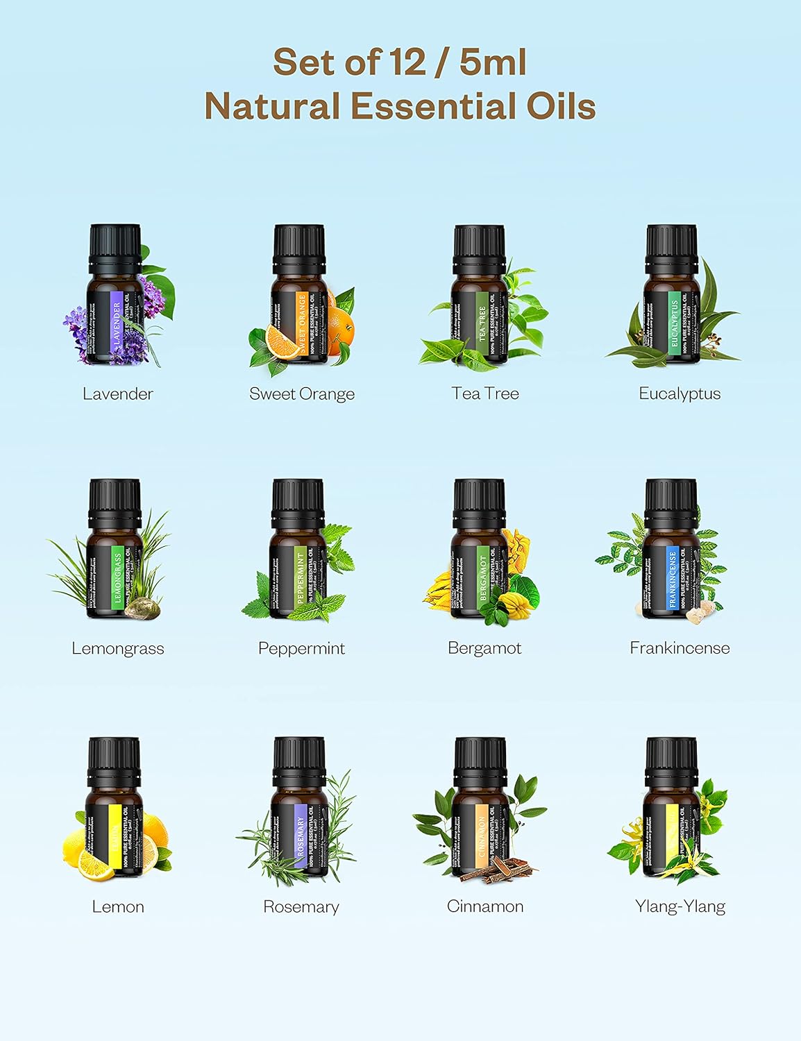Which 12 Important Oils It Has?: Lavender, Candy Orange, Tea Tree, Eucalyptus, Lemongrass, Peppermint, Bergamot, Frankincense, Lemon, Rosemary, Cinnamon & Ylang-Ylang. All oils are packed in 5ml amber jars, to keep away from solar degradation.