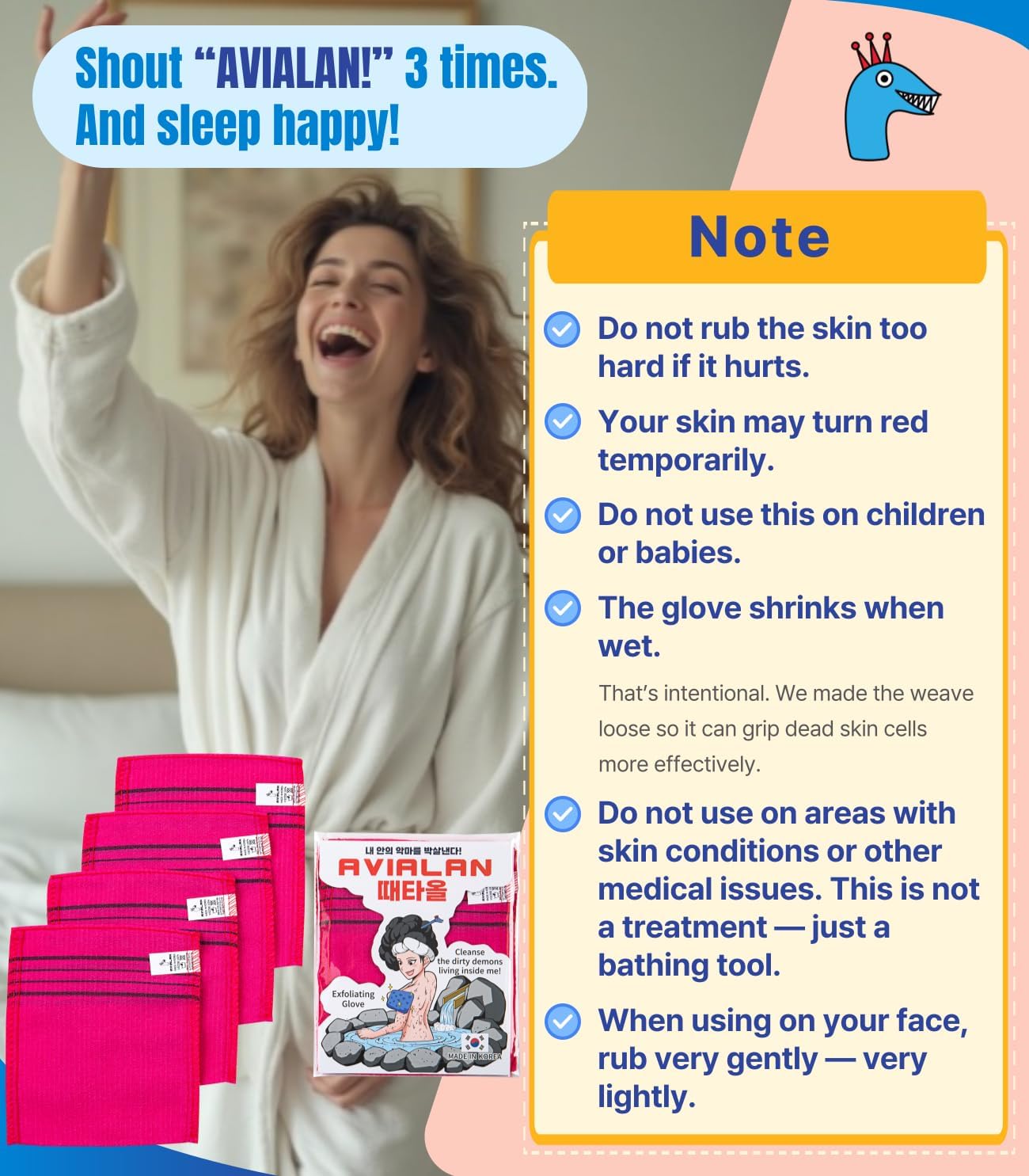 ‘avialan’ doesn’t harm. Our exfoliating gloves are smooth. To see the perfect impact, soak your physique in heat water for at the very least quarter-hour. The longer the time, the hotter the water, the higher. And first, rub your complete physique as soon as with a light-weight depth (the depth of scratching an itchy spot). After that, soak your physique within the water for about 5 extra minutes and rub your physique with the depth you assume is correct. Then, the numerous soiled demons residing inside you’ll crawl out and be cleaned. After bathing, Shout ‘avialan’ 3 occasions and go to a snug sleep.