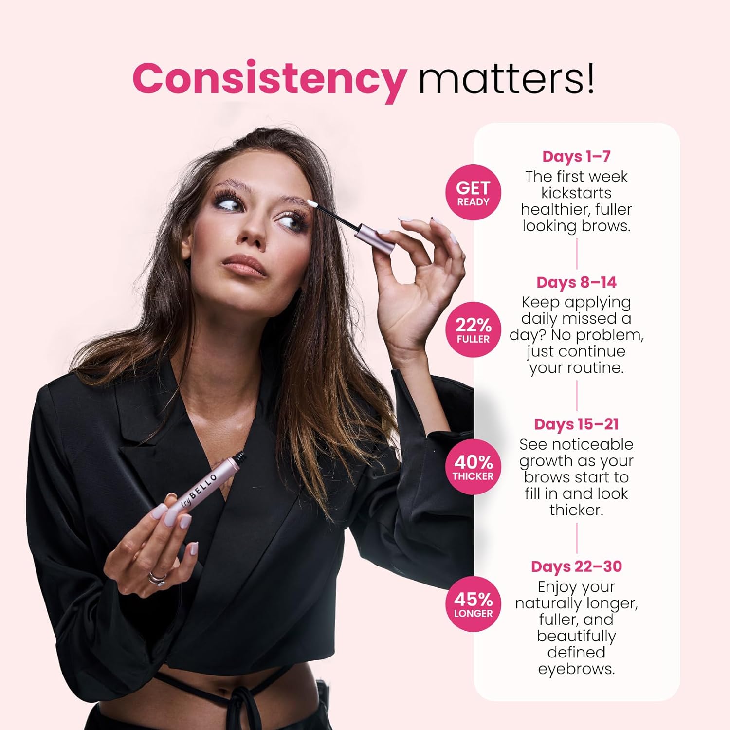 VISIBLE RESULTS IN 6–8 WEEKS – Constant use of this premium therapy reveals improved thickness, density, and hair development, delivering brows that look younger and daring.