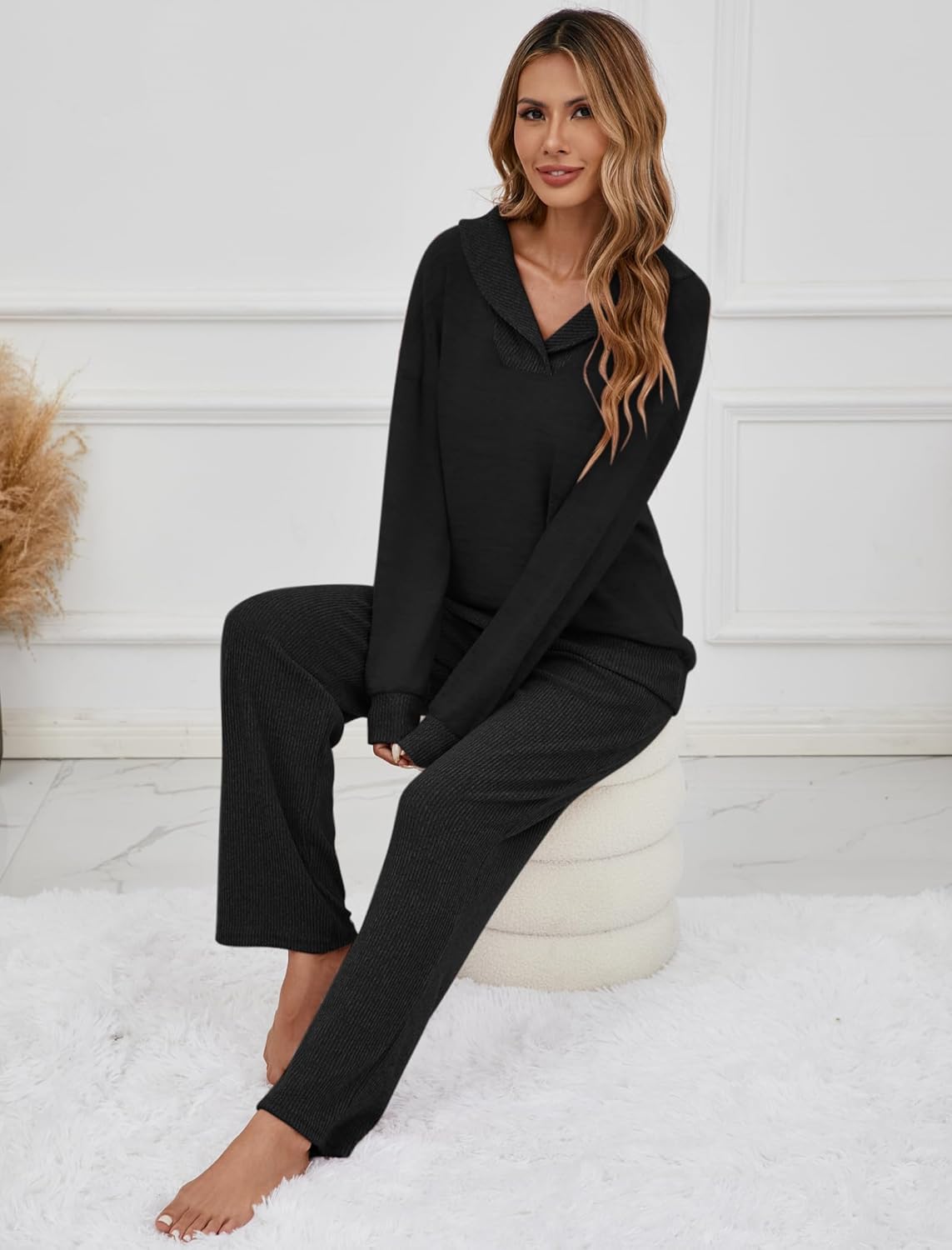 Be the first to review “Famulily Womens 2 Piece Ribbed Knit Set Shawl Collar Long Sleeve Top and Pockets Pant Matching Lounge Sets”