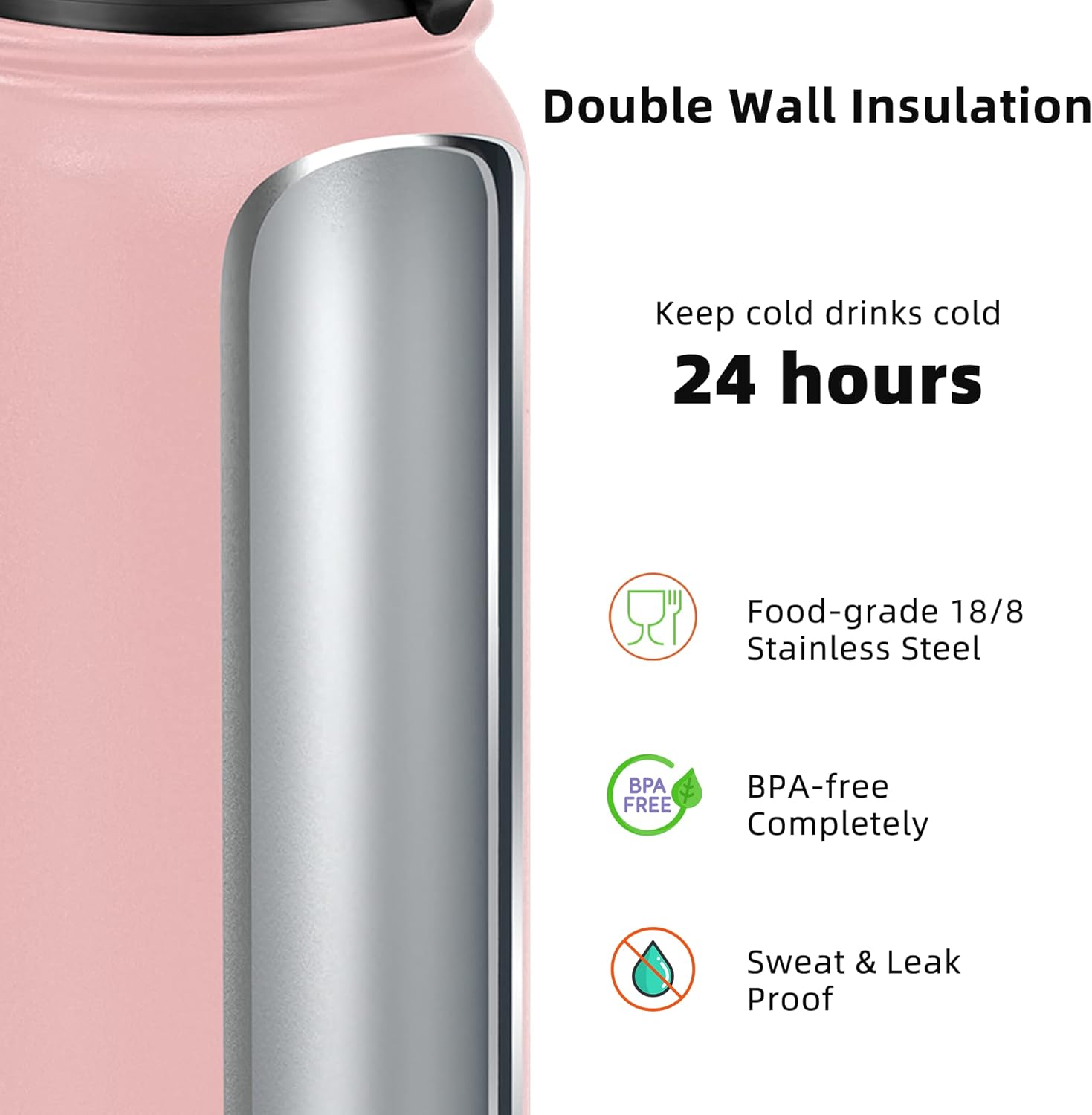 Fanhaw 20 Oz Insulated Stainless Steel Vacuum Water Bottle with 2 Lids (Pop-Open & Carabiner Lid) – For Kids, Women, Men | Leak & Sweat Proof (Pink)