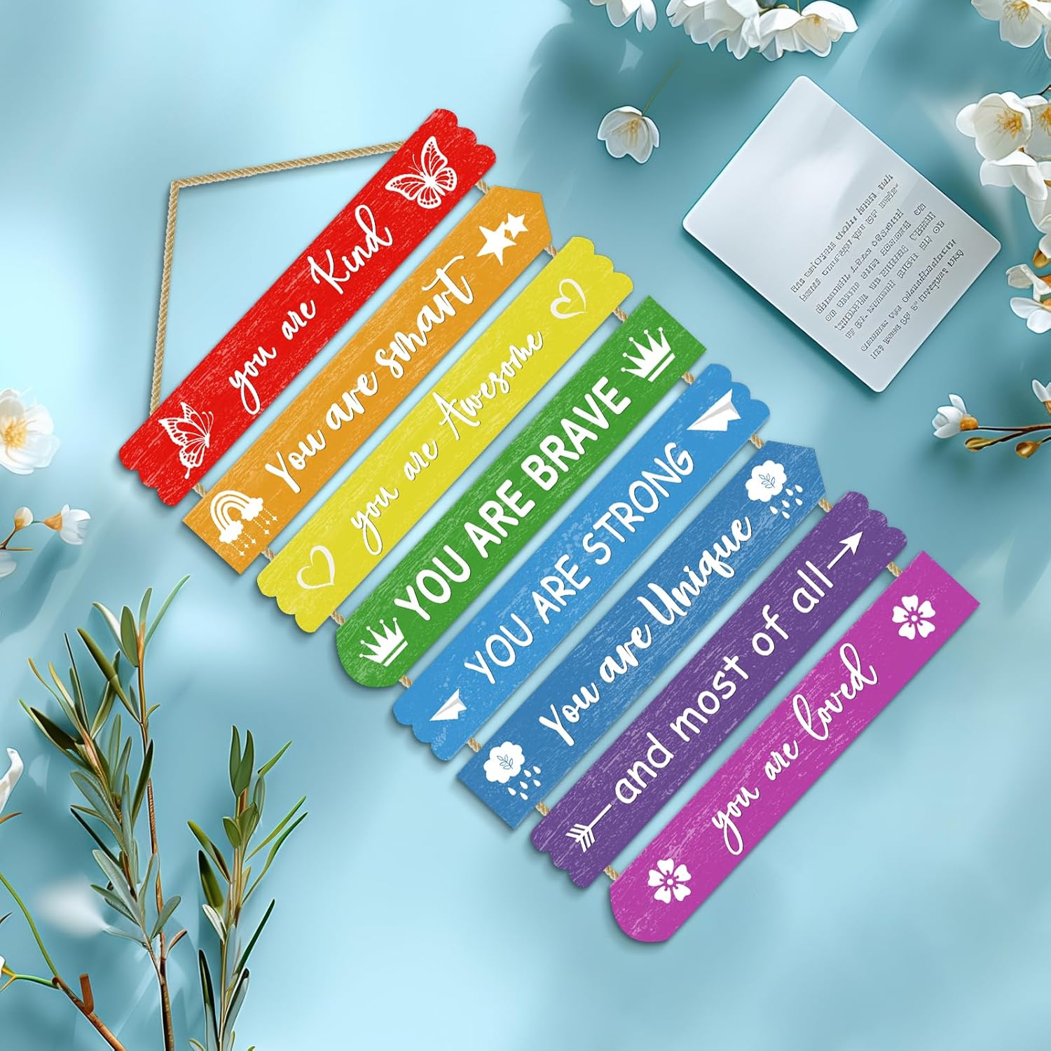 REASONABLE SIZE DESIGN – Our rainbow wall decor artwork signal consists of 8 items of MDF. Measures 11.4 inches * 2 inches and has a thickness of 0.2 inches. Appropriate for any fashion of aesthetic bed room ornament. Comes with lengthy twine for simple wall hanging