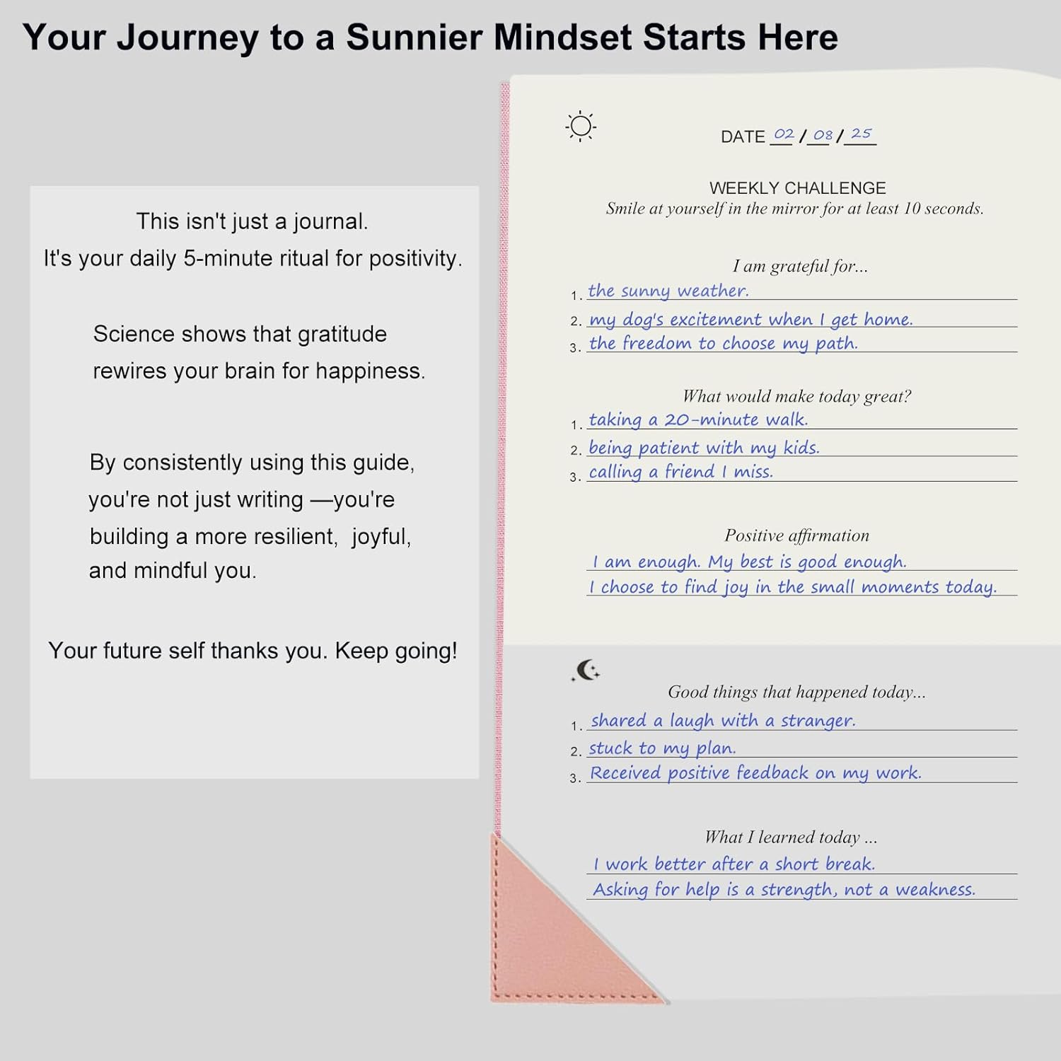 Scientists have confirmed that expressing gratitude can assist construct a happier mindset, cut back stress and poisonous feelings, and procure many extra constructive outcomes. Our The Gratitude Journal will aid you domesticate an angle of gratitude in your life, deal with the great, and recognize the small issues. This apply solely takes 5 minutes a day, permitting you to remodel your life progressively and effectively.