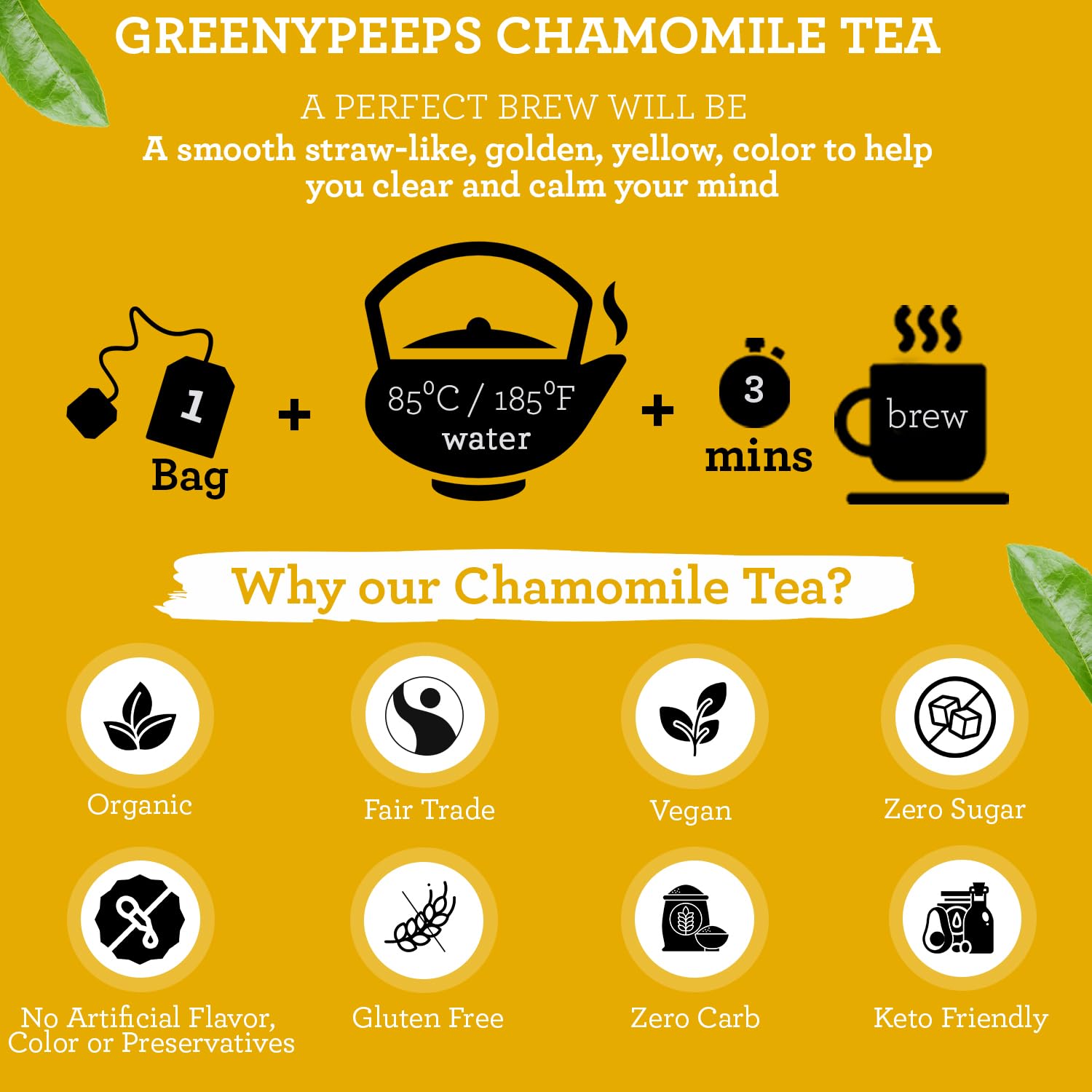 Be the first to review “Greenypeeps Organic Chamomile Tea Bags Caffeine Free – Fresh and Pure Floral Infusion with Subtle Sweetness – Chamomile Herbal Tea Bags – Eco Friendly – Camomile Tea Non Caffeinated – 20 Count”