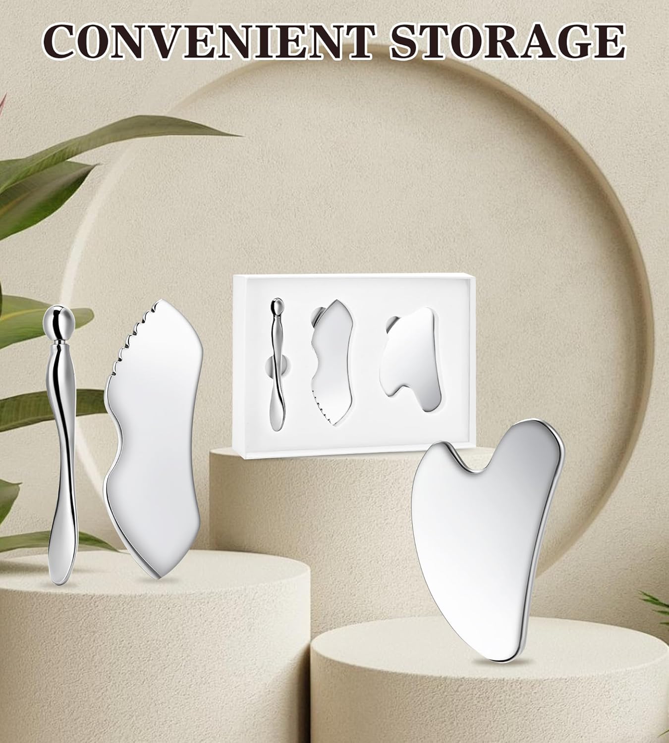 Gua Sha Facial Instruments, 3 in 1 Stainless Metal Metallic Guasha & Eye Cream Applicator Facial Sculpting Device Set Eye Massager Lymphatic Drainage for Face Neck (Present Field Set)
