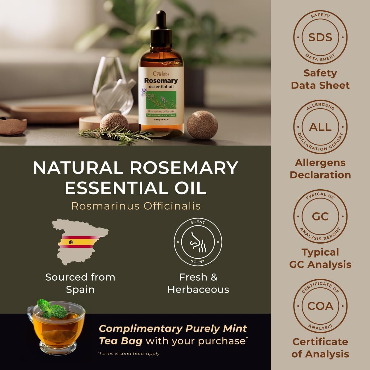 Gya Labs Rosemary Essential Oil Set for Hair – Huge 4 Fl Oz – 100% Pure Natural Rosemary Oil for Hair, Skin, Scalp, Diffuser & Candle Making Scent – with 3g Purely Mint Herbal Tea