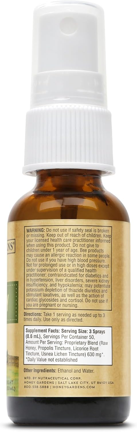 Honey Gardens Bee Propolis Throat Spray Apitherapy Raw Honey Licorice Root and Usnea 1 fl ozHoney Gardens Bee Propolis Throat Spray Apitherapy Raw Honey Licorice Root and Usnea 1 fl oz