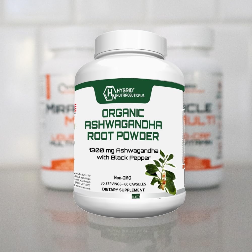 Hybrid Nutraceuticals Organic Ashwagandha Root Powder Capsules 1300mg, with Black Pepper Extract – Stress and Immune Support – 60 Capsules