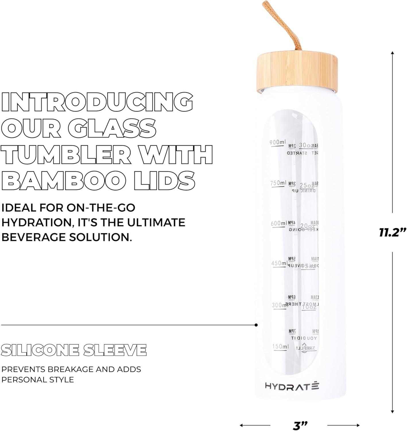 Be the first to review “HYDRATE Glass Water Bottles 32 oz – 2 Bamboo Lids & Fruit Infuser – Insulated Silicone Sleeve – Strong Borosilicate Glass – Refillable Time Schedule Glass Sports Bottle – 11″ Hx3 Lx3 W – White”