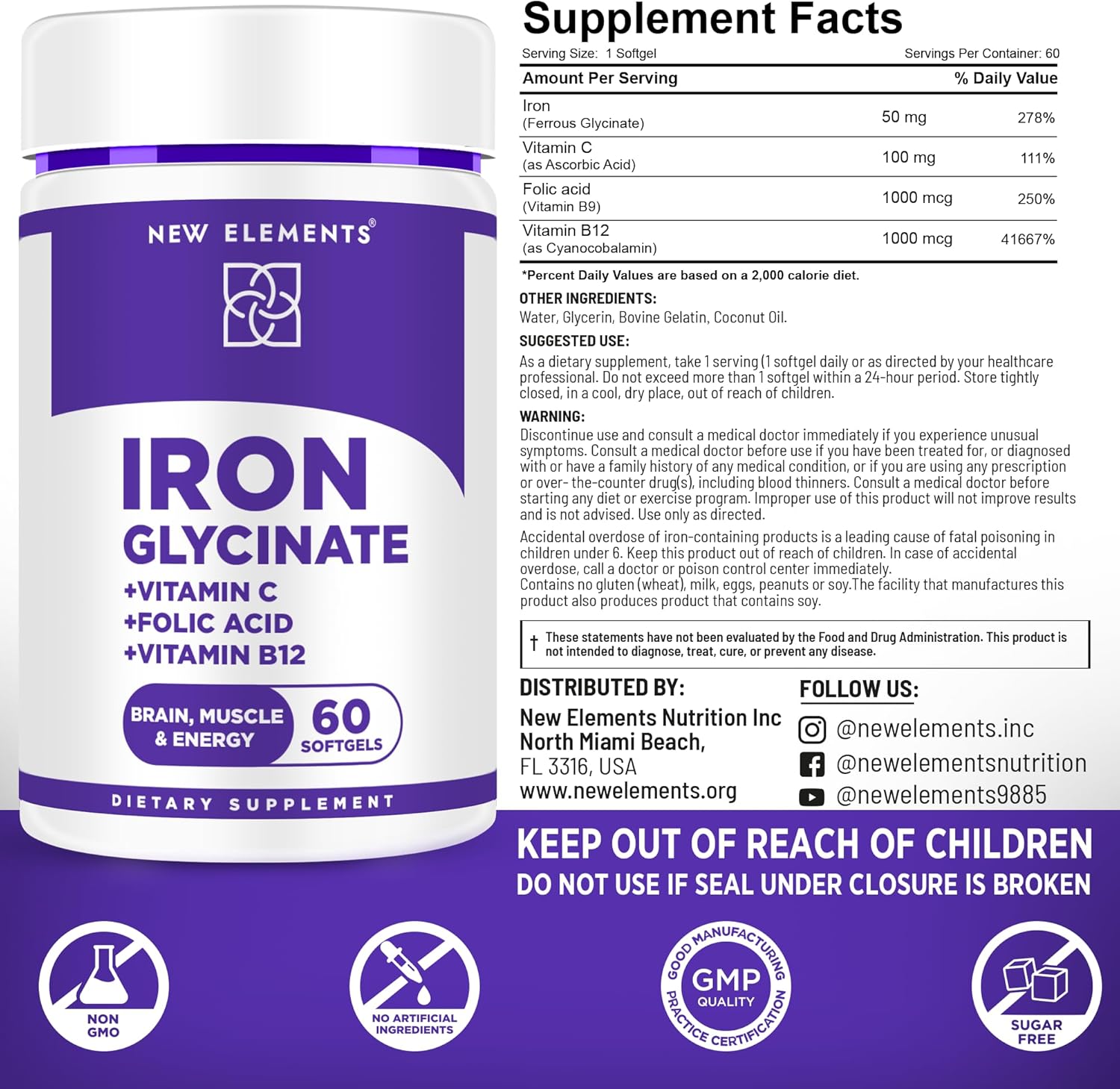 Iron Glycinate 50mg with Vitamin C, Folic Acid & B12 | Advanced Iron Supplement for Anemia Relief, Energy Boost & Immune Support | Gentle on Stomach, Fast Absorption | Natural Softgels for Women & Men