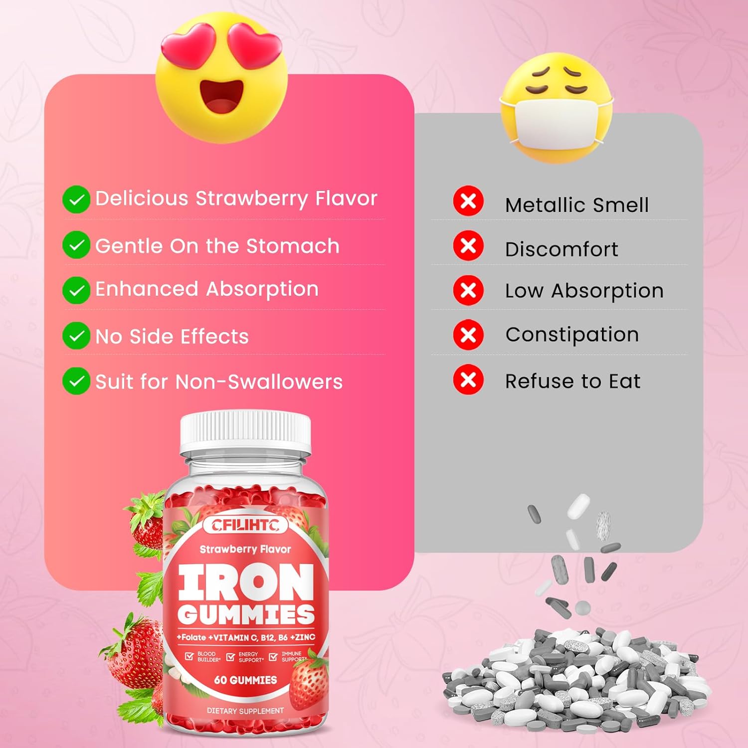 NOURISH YOUR BLOOD HEALTH: CFILIHTC iron complement is important for hemoglobin and purple blood cell manufacturing. Our gummies, fortified with Folate and B12, promote wholesome blood cell formation, forestall anemia, and improve oxygen transport within the physique.