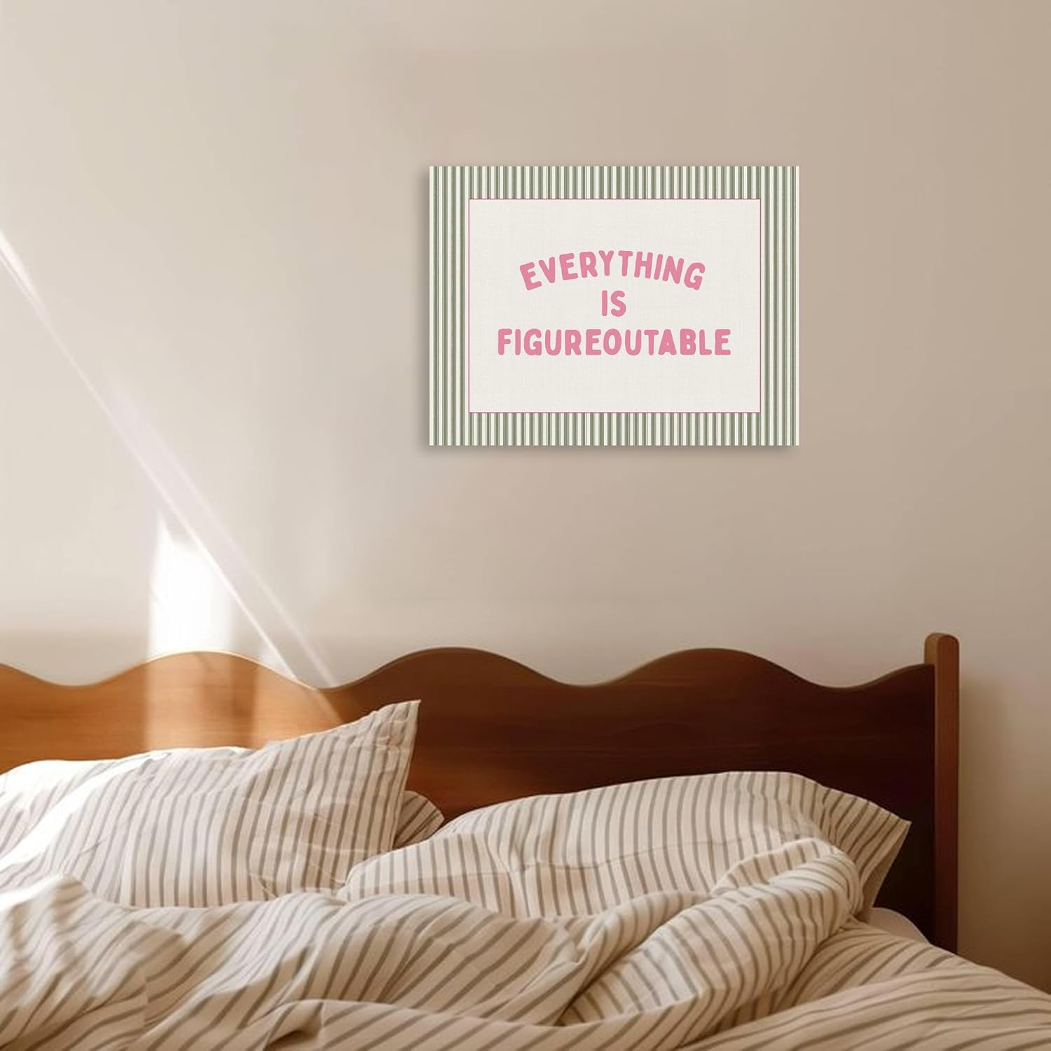 Brighten your day and your area with the IWGDNJS “The whole lot Is Figureoutable” Motivational Canvas Wall Artwork. This 11×14 inch print blends fashionable pastel colours with an encouraging message — a day by day reminder that no problem is just too massive to resolve. With smooth pink lettering set in opposition to a refined sage inexperienced stripe border, it’s the right steadiness of favor and inspiration. Whether or not you’re adorning a comfy bed room, a cheerful workplace, or a teen’s examine nook, this canvas brings readability, confidence, and allure to each wall.
