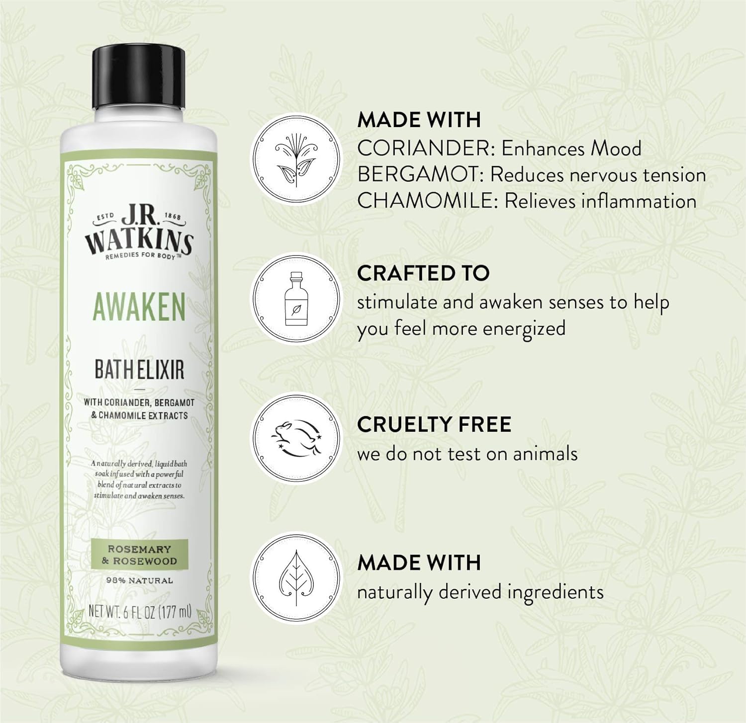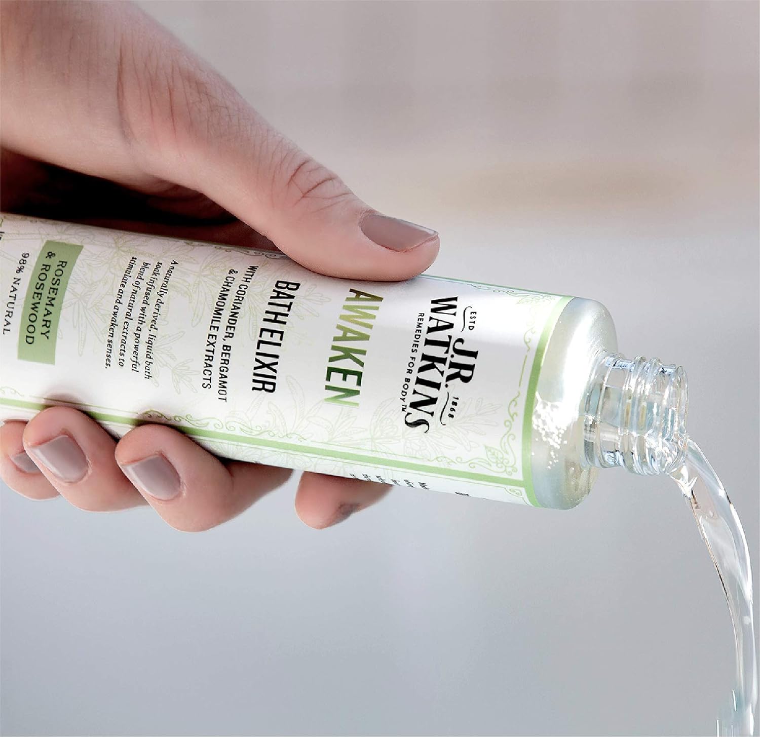 Luxurious Tub Soak: J.R. Watkins AWAKEN Tub Elixir is a naturally derived liquid bathtub soak that lightly stimulates and awakens the senses with highly effective, naturally derived extracts. No grainy residue left behind.