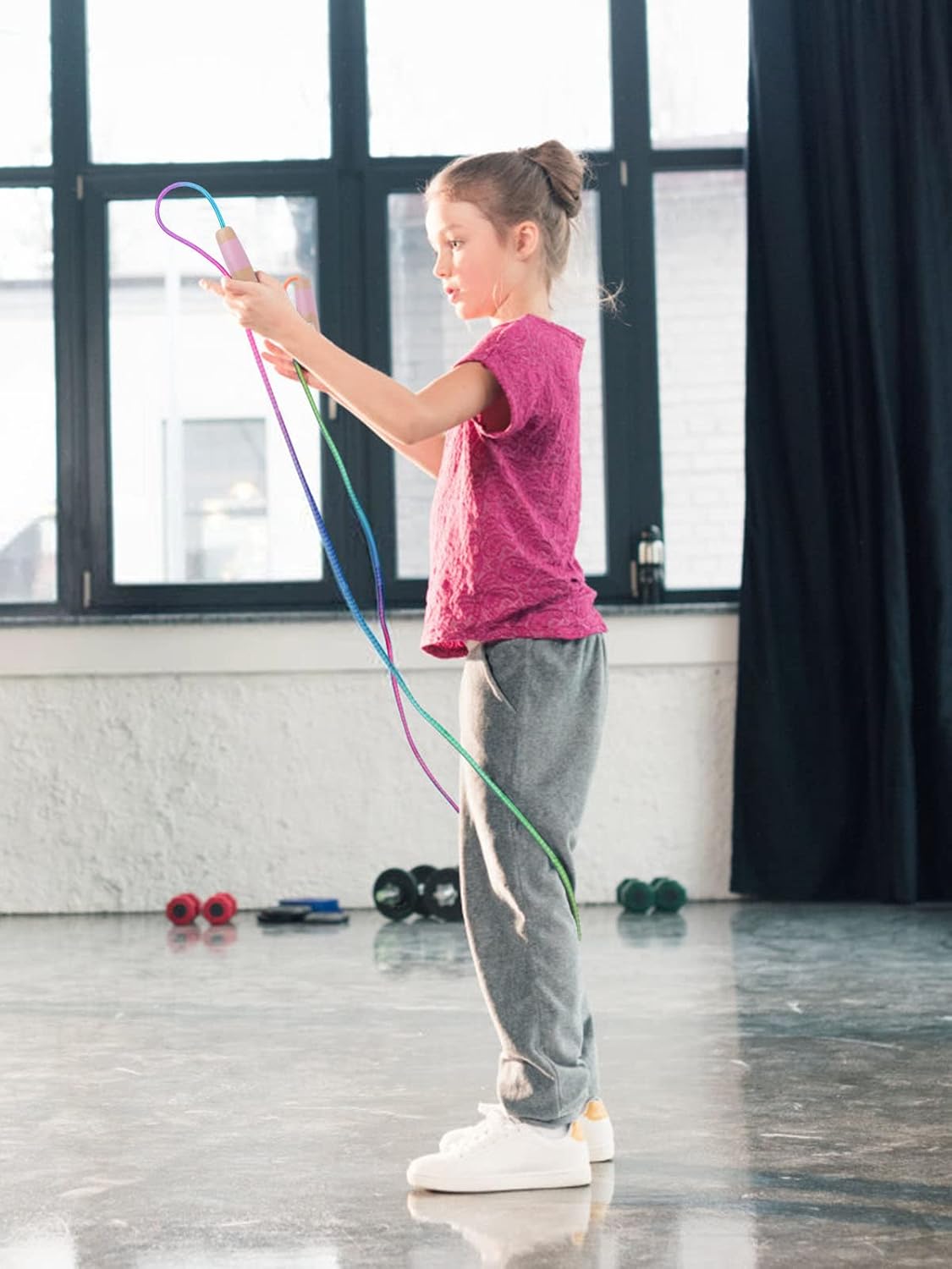 【Skipping Rope】You’re going to get 2 pcs 9.2ft/ 2.8m size rainbow soar ropes with picket deal with, lengthy sufficient for adjustable. Enjoyable exercise video games can play with pals or household.