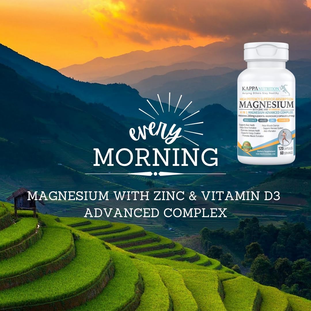 Kappa Nutrition Magnesium 4-in-1, 280mg Elemental Magnesium (Bisglycinate, Malate) + Zinc & Vitamin D3, Brain, Sleep, Energy, Muscle, Immune Support, 120 Vegan Capsules.