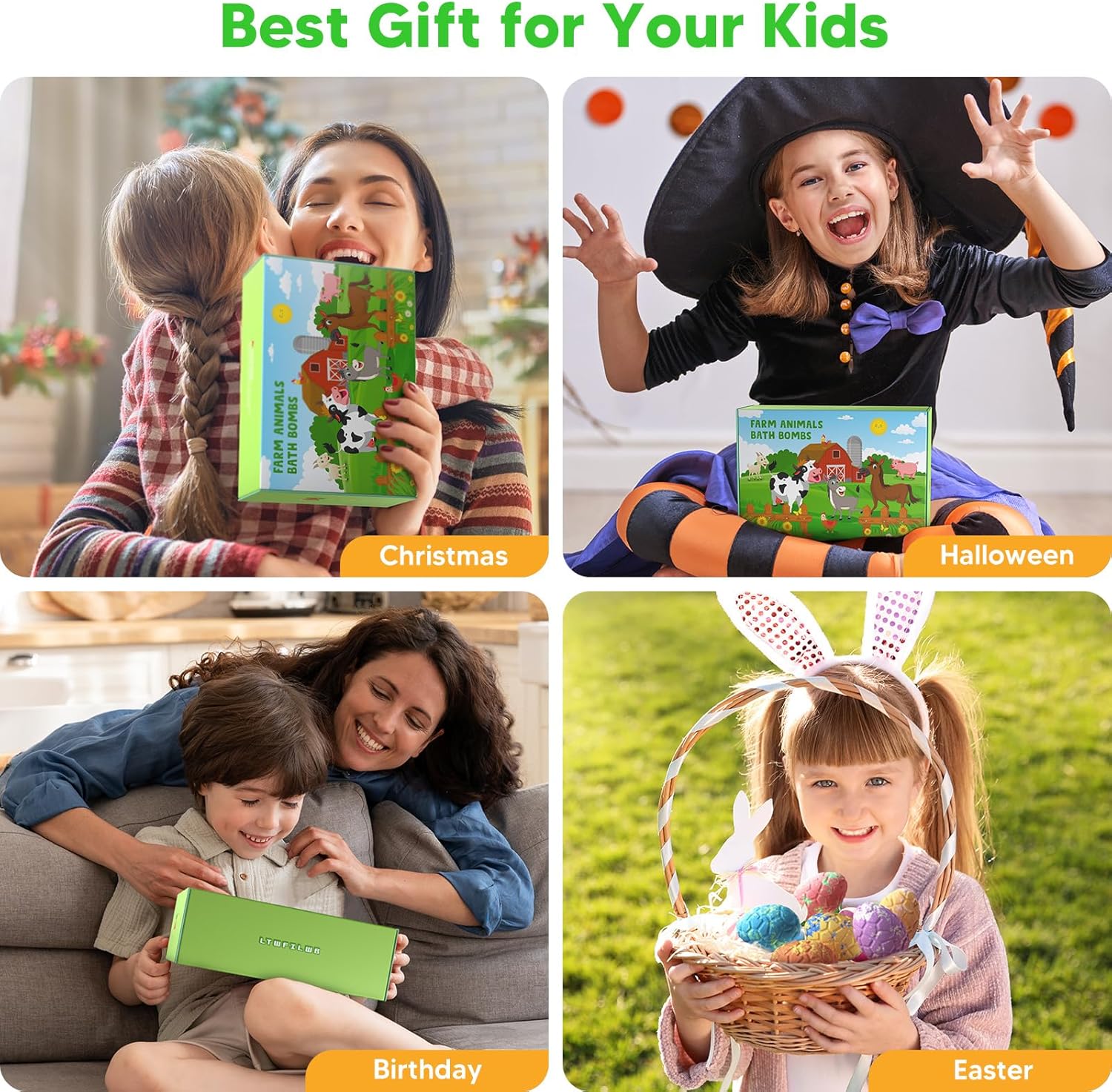 【Farm Animal Tub Bombs for Youngsters】Our tub bombs set comprises 12 totally different individually packaged dino egg tub bombs, every of which has a distinct coloration and scent, additionally comprises 12 totally different farm animal toys inside. As soon as dropped the bathtub bombs in water, they may float and poo, giving the water a vibrant coloration and releasing important oils aroma. The shock animal toys additionally reveals when the bathtub bomb fizzes out, carry expertise for youths the perfect surprises when bathing time.
