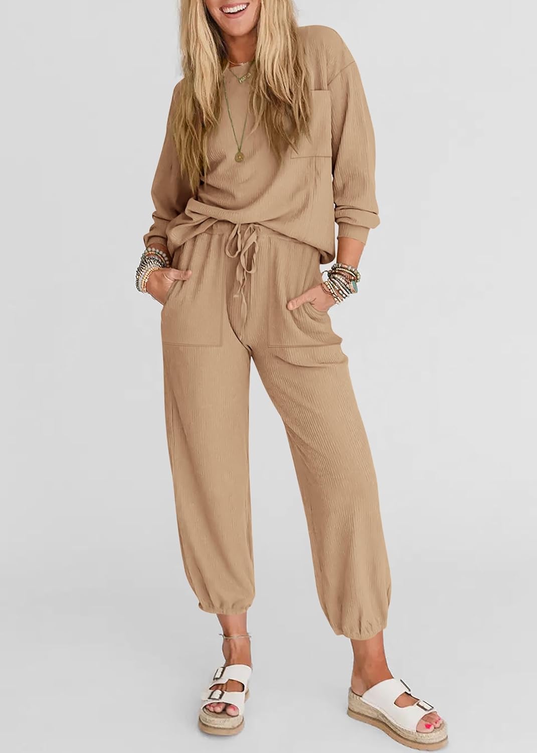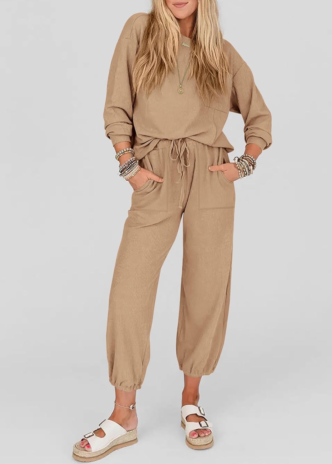 Crafted From Ribbed Knit Material, This 2 Piece Outfits Present a Textured And Fashionable AppearanceLounge Put on For Girls Is Unfastened-Becoming. High Is a Bit Outsized Fashion, and Lengthy Pants Have An Elastic Waist And a Drawstring Design