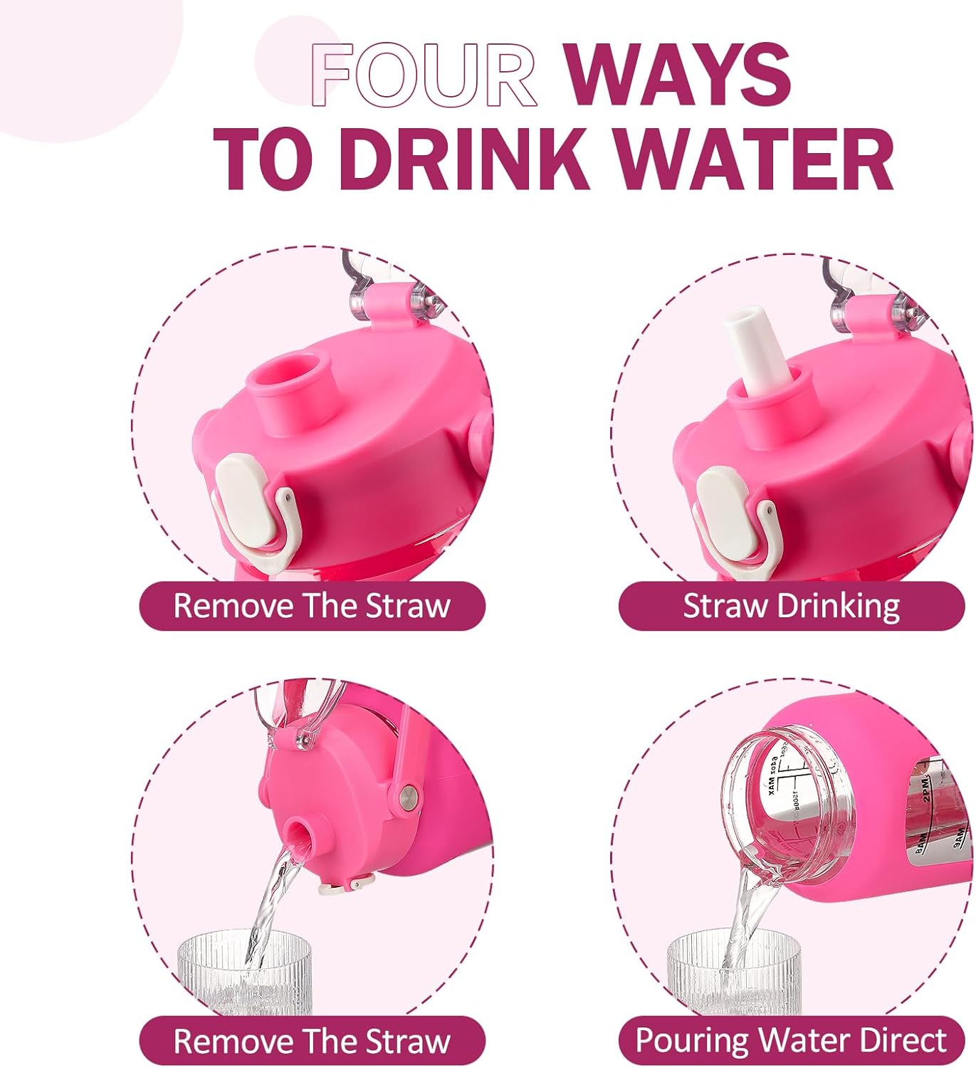 ❤Glass Water Bottle with Pop-up Straw Lid- Our 64oz water bottle with straw is designed with an upgraded lid that ensures 100% leakproof and dustproof. Superior one-click button makes you drink simpler, simply push the button and the straw will come out robotically.