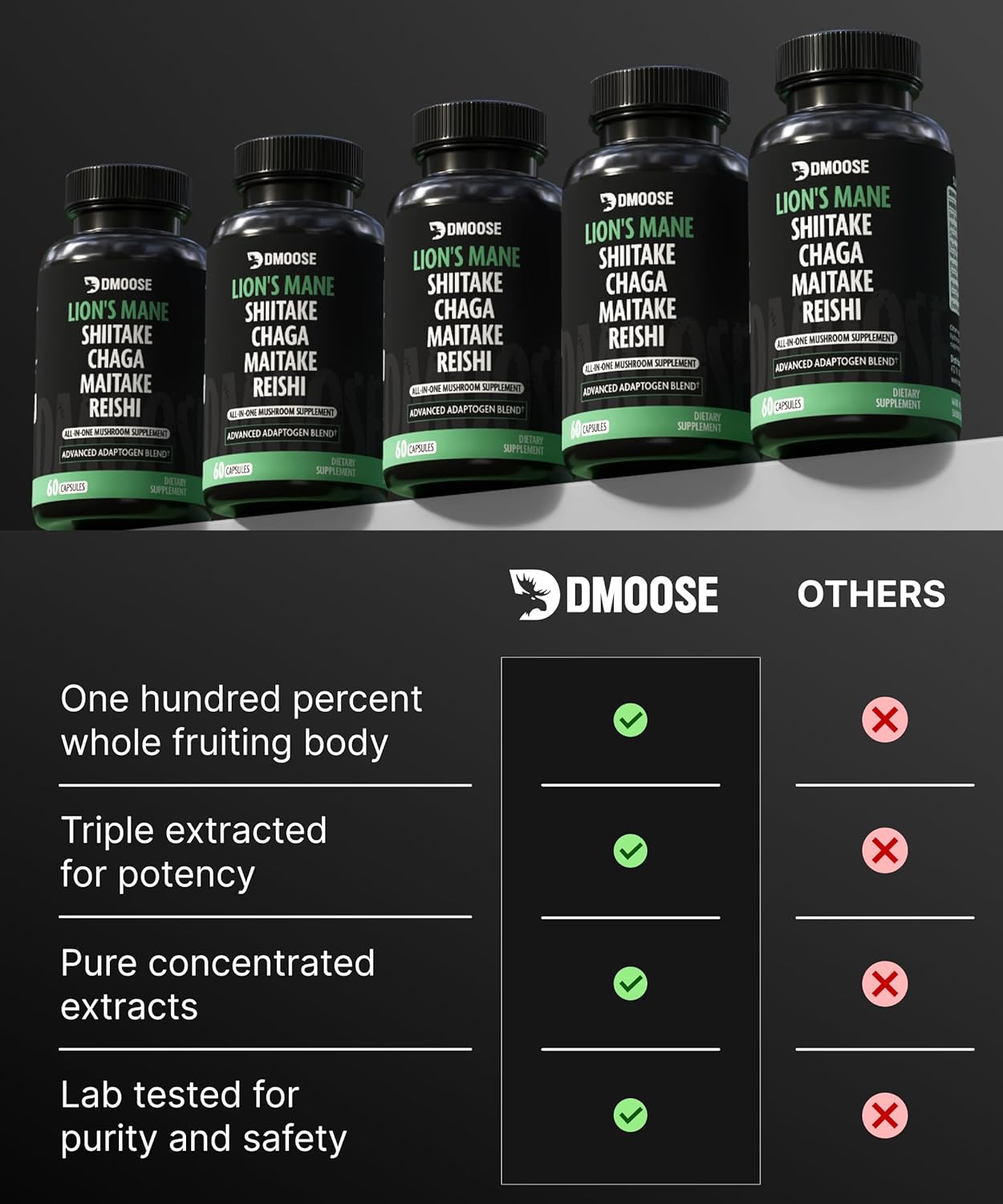 5 MUSHROOMS IN 1 POWERFUL CAPSULE: Simplify your well being routine with DMoose Mushroom Dietary supplements, a potent 5-in-1 formulation combining Lions Mane, Chaga, Maitake, Shiitake, & Reishi Mushrooms. Every capsule gives boosting advantages to help your mind well being, reminiscence, focus, power, and immune help.
